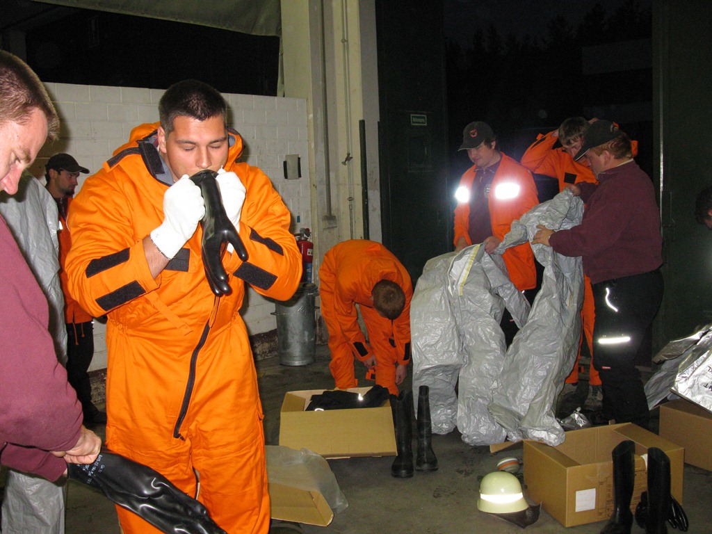Der Aufbau und der Betrieb einer Dekontaminationsstraße für kontaminierte Verletzte war dann Inhalt der Ausbildung am nächsten Tag. Da der Aufbau schon mehrfach geübt worden ist und nur wenige Neue dazugekommen ist, hat dies reibungslos geklappt. Nachmittags wurde dann die Dekontamination mit verschiedenen Verletzten durchgespielt.