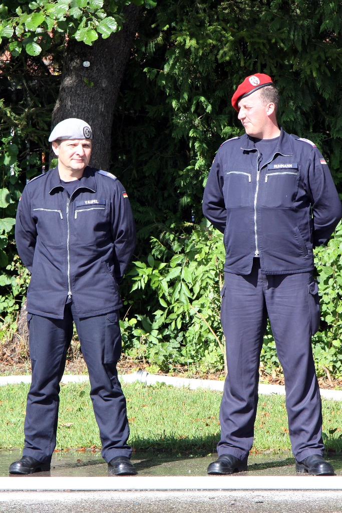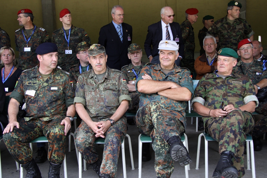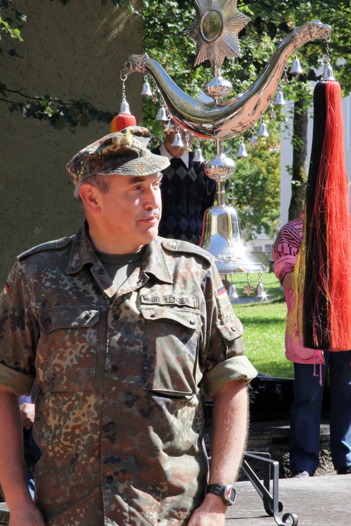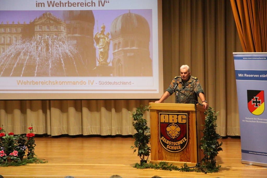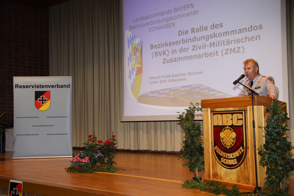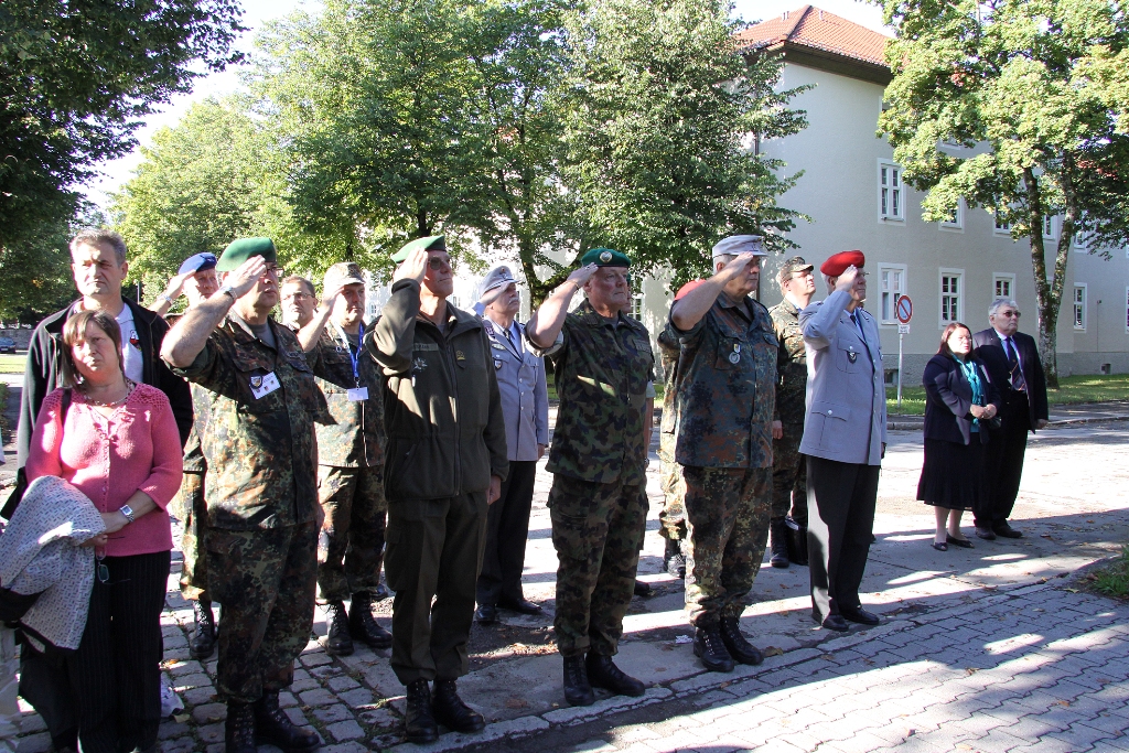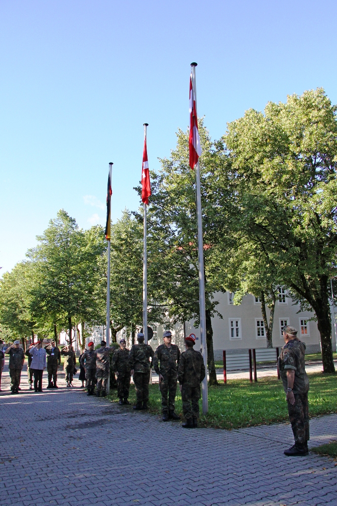 Nach der Flaggenparade mit den Hymnen Österreichs, der Schweiz und Deutschlands, gespielt durch den Reservistenmusikzug JaBoG 34 Allgäu, konnte der Landesvorsitzende des Reservistenverbandes, OTL d.R. Prof. Dr. Friedwart Lender, Vertreter aus Politik, Militär aus dem In- und Ausland sowie Vertreter der ABC- und Selbstschutzschule begrüßen. Unter ihnen den Bürgermeister der Stadt Sonthofen, Wolfgang Deppe, mehrere Stadträte, den Befehlshaber des Territorialkommandos 4 aus der Schweiz, Divisionär Hans-Ulrich Solenthaler, den Stellvertretenden Befehlshaber im Wehrbereich IV SÜDDEUTSCHLAND, Brigadegeneral Johann Berger, den Stellvertretenden Schulkommandeur, Oberst Peter Hentrich, sowie den Stellvertretenden Militärkommandanten von Voralberg/Österreich, Oberst Johannes Grissmann.