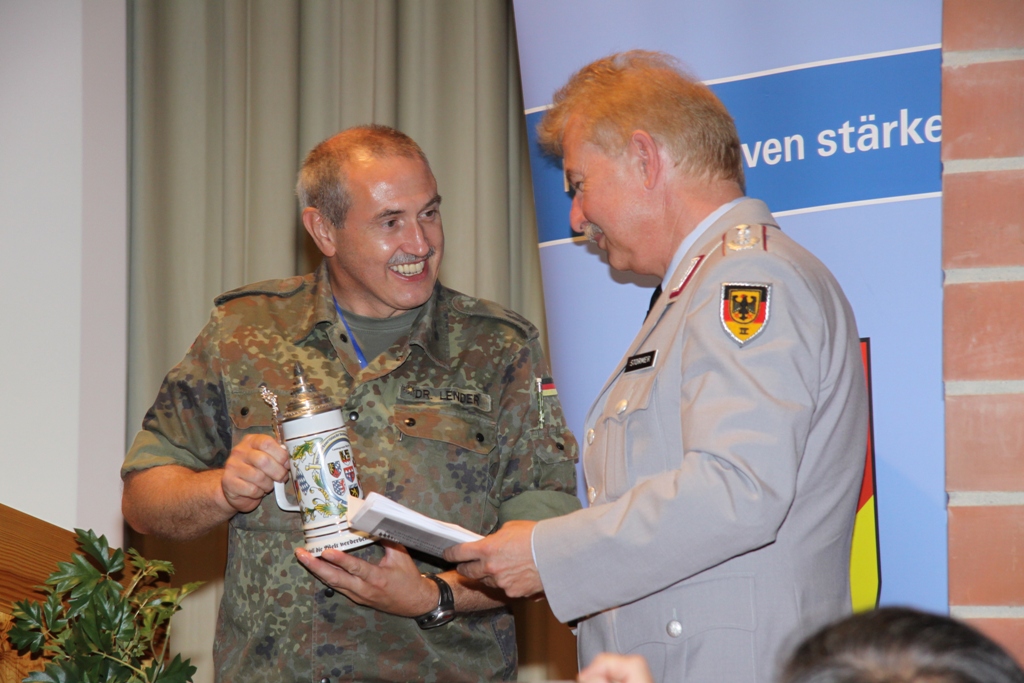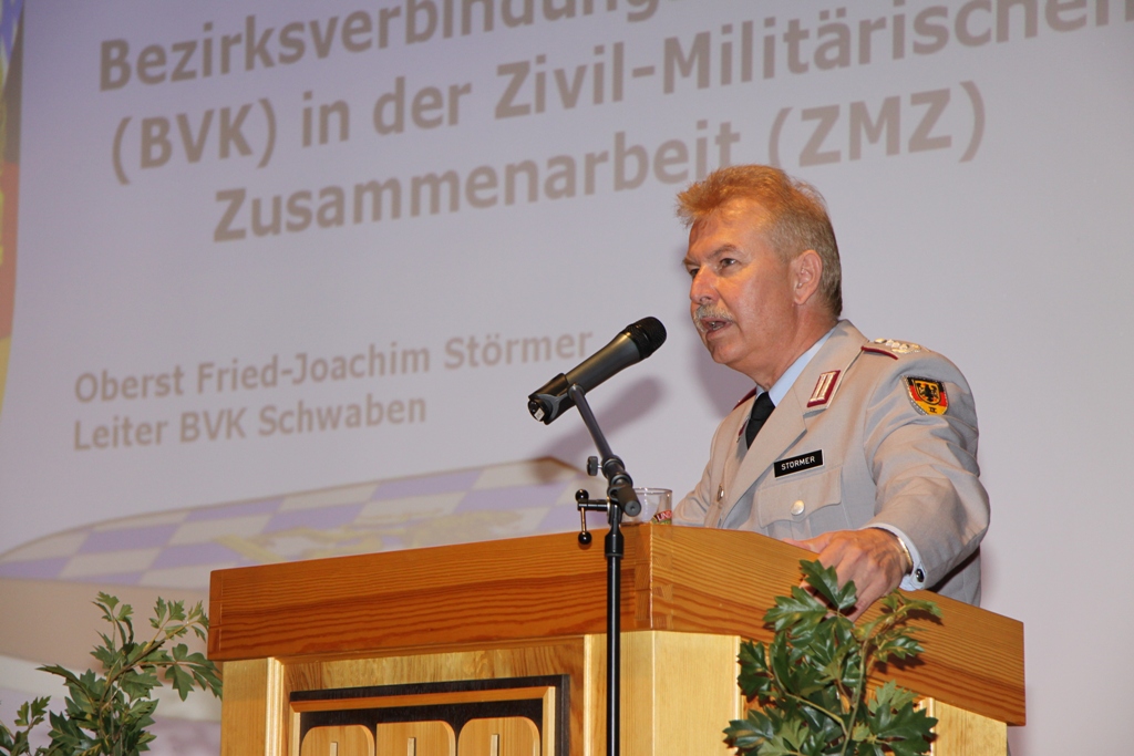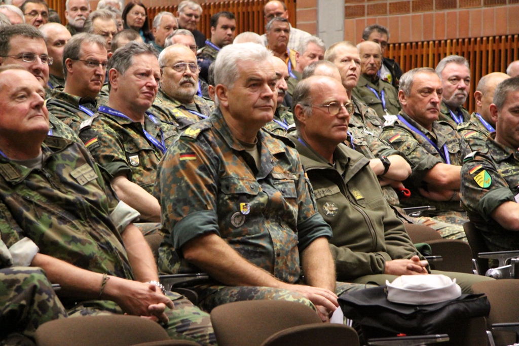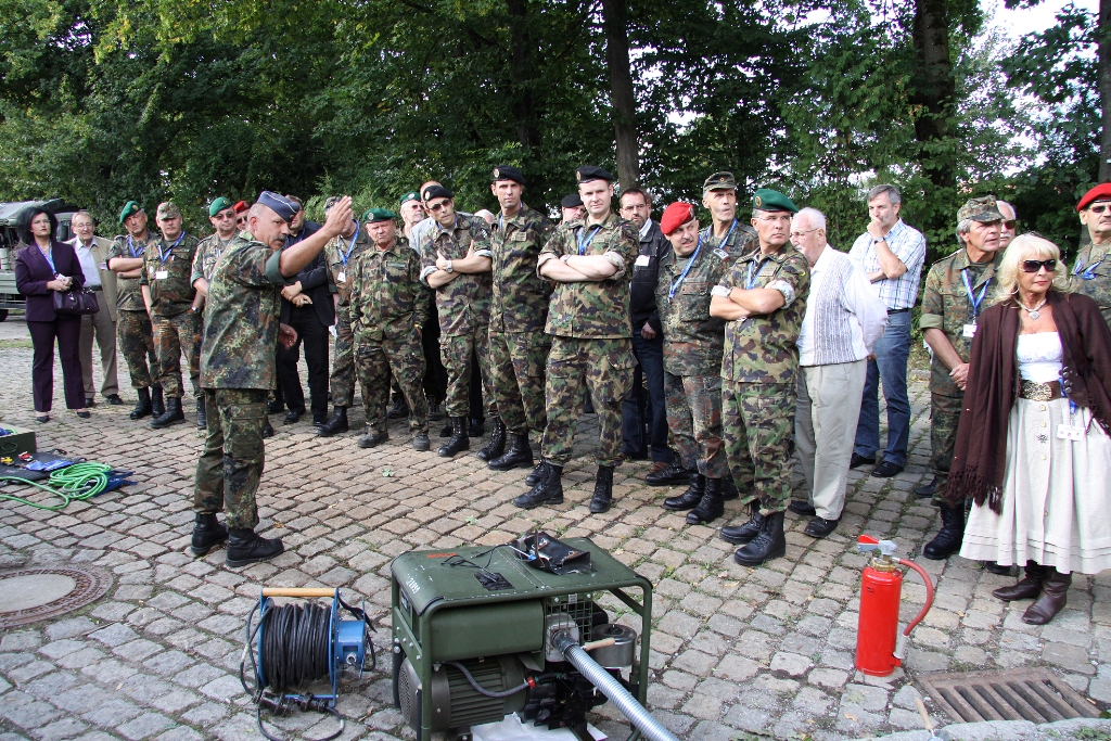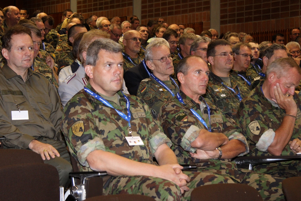 Mittelpunkt der Veranstaltung war in diesem Jahr die grenzüberschreitende Information und der Erfahrungsaustausch. Gerade Katastrophen zeigen deutlich, dass sie vor Grenzen nicht halt machen und eine militärische Zusammenarbeit erforderlich ist. Als zentrales Thema der Bodensee Militär-Reunion hatten die Verantwortlichen deshalb die Hilfe bei Katastrophen durch Reservisten und aktive Truppe gestellt. In seinem Vortrag stellte Brigadegeneral Berger das System der zivil-militärische Zusammenarbeit in Süddeutschland vor. Dabei skizzierte er deren Aufgaben auf den unterschiedlichen hierarchischen Ebenen bis hinunter zu den Kreisverbindungskommandos. Ebenso ging Berger auf die Modellerprobung der regionalen Initiativen der Katastrophenhilfe bei Reservisten ein. Oberst d.R. Fried-Joachim Störmer, Leiter des Bezirksverbindungskommandos Schwaben, referierte über seine Arbeitsebene.