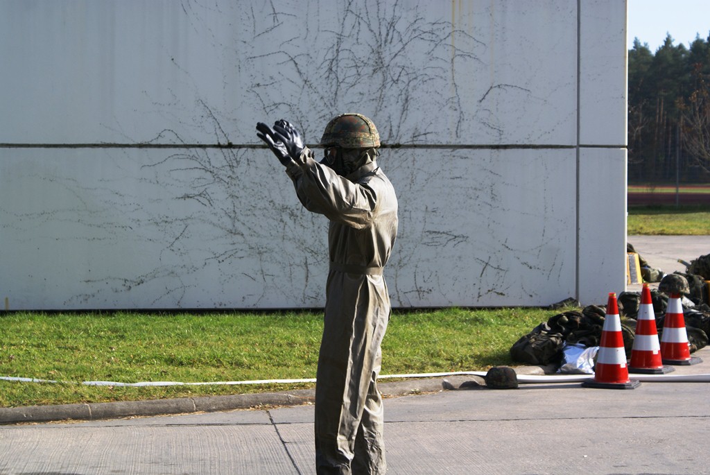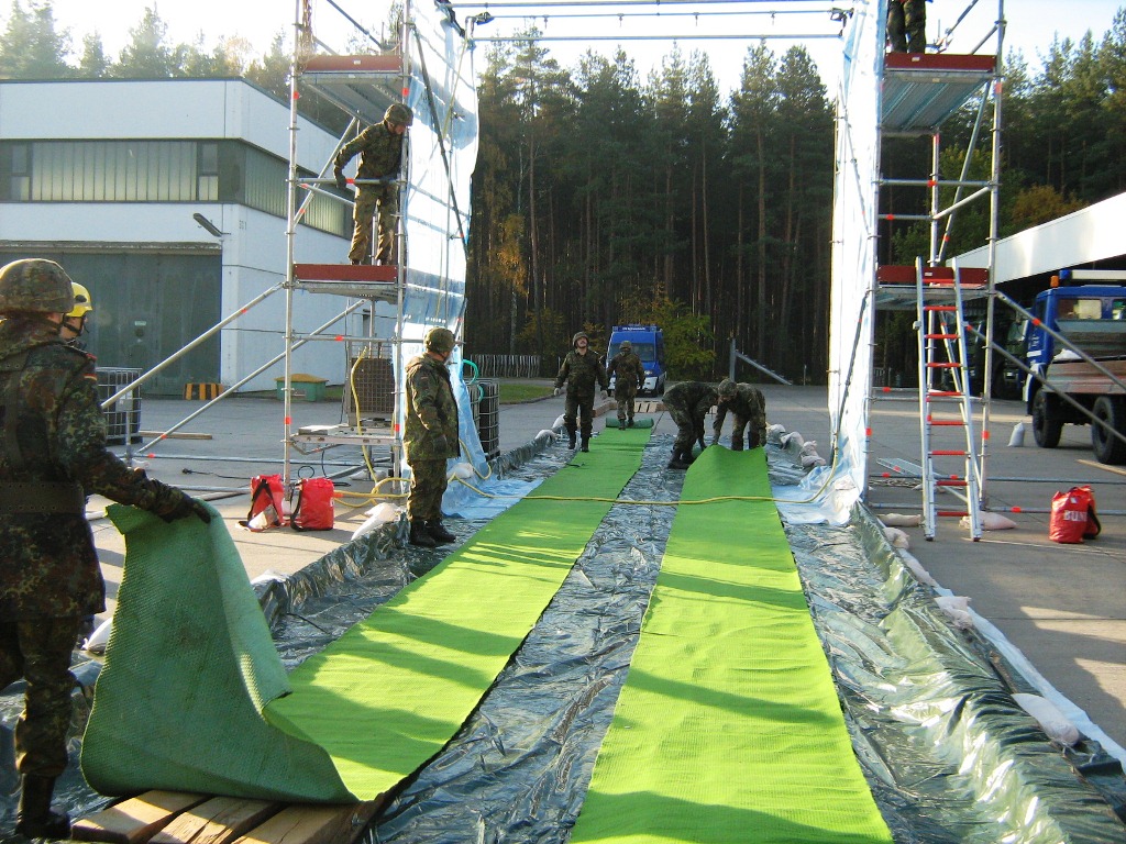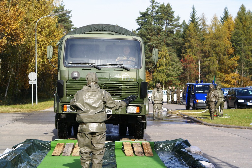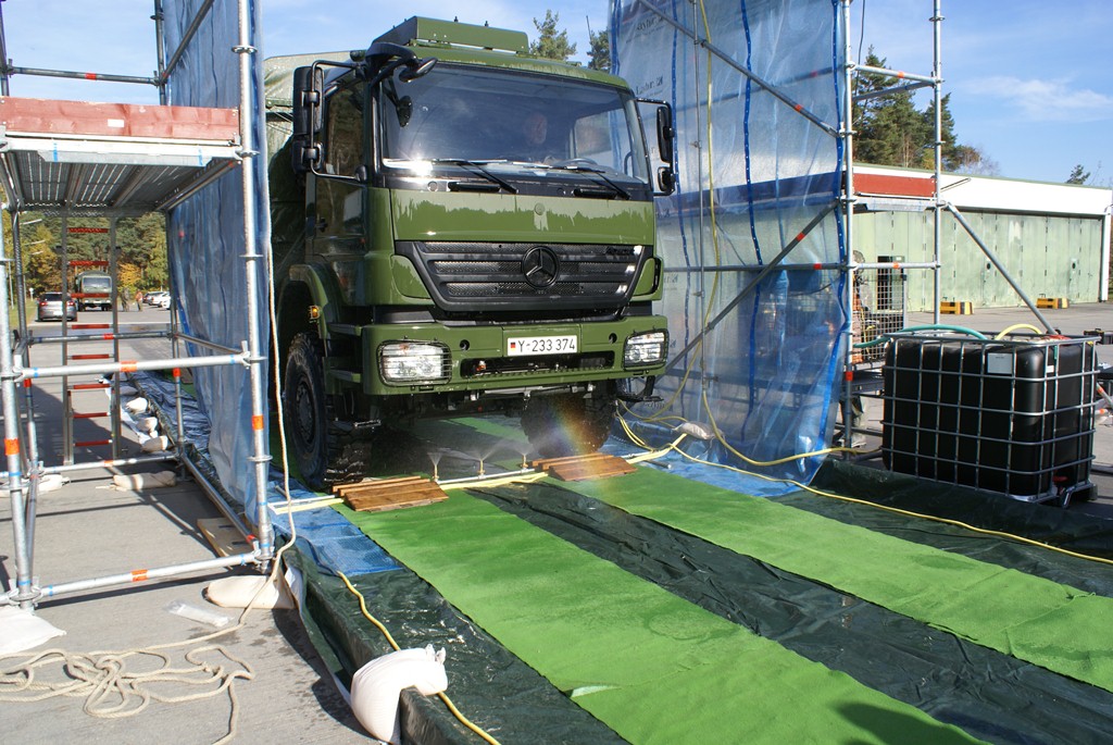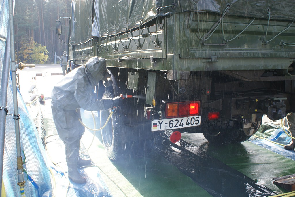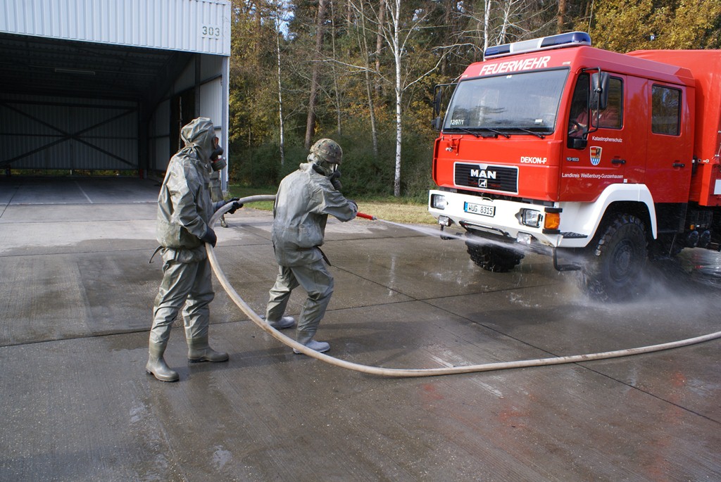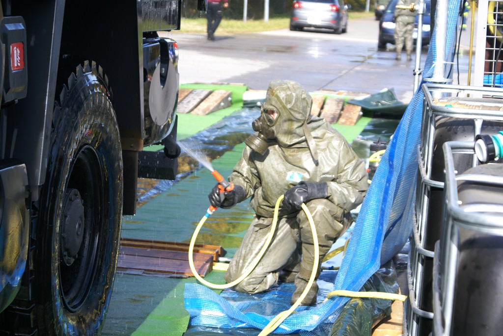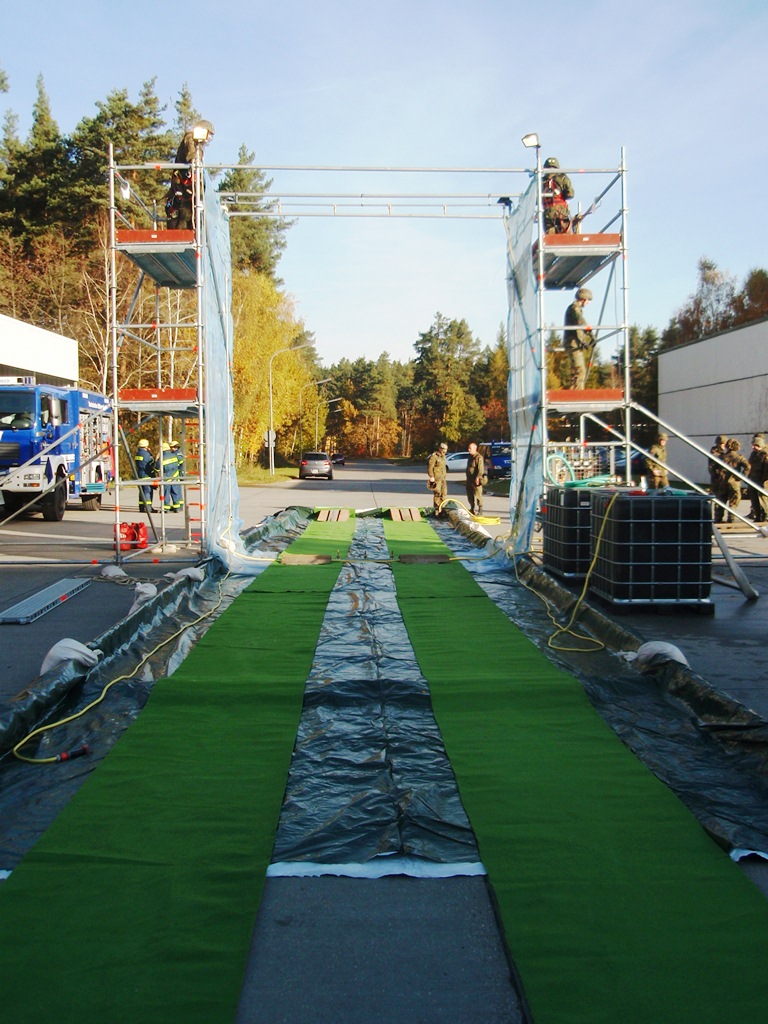 Aus diesem Sachverhalt heraus hat sich die Arbeitsgemeinschaft (AG) ABC-Schutz mit dem THW zusammengetan und in einer gemeinsamen Übung den Aufbau aber vor allem den Betrieb der Dekontaminationsschleuse für Fahrzeuge geübt. Im Grunde unterscheidet sich die Dekontaminationsschleuse nicht wesentlich von Einrichtungen der Bundeswehr. Der Betrieb war daher für die Soldaten auch nichts Ungewöhnliches.