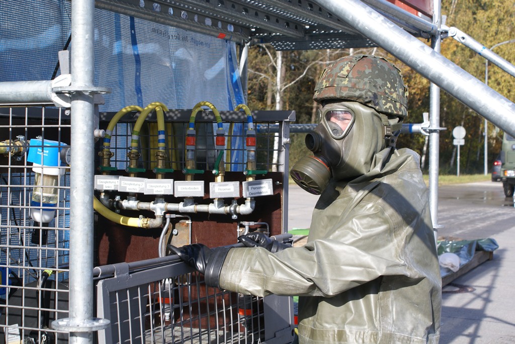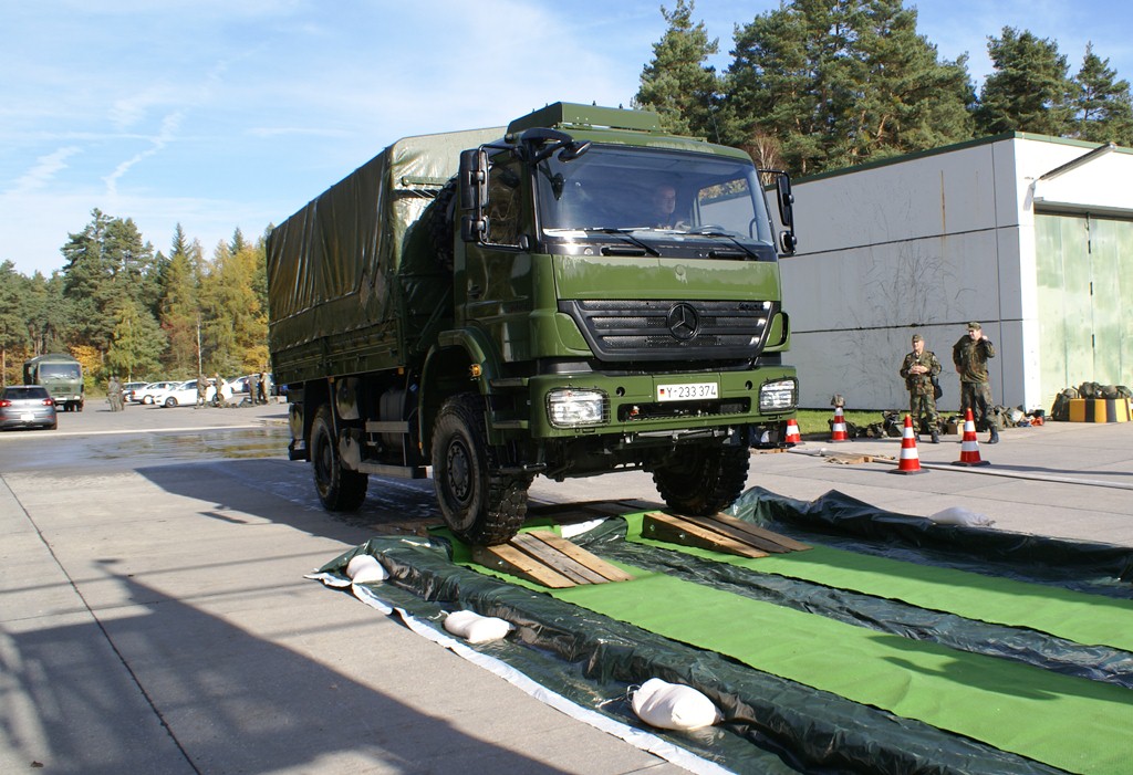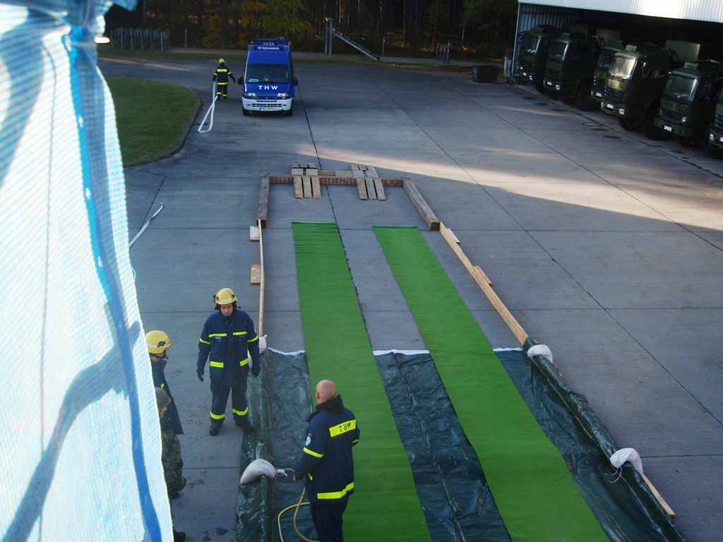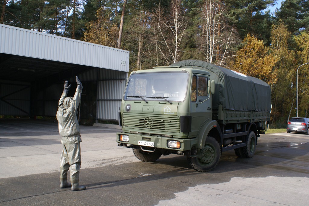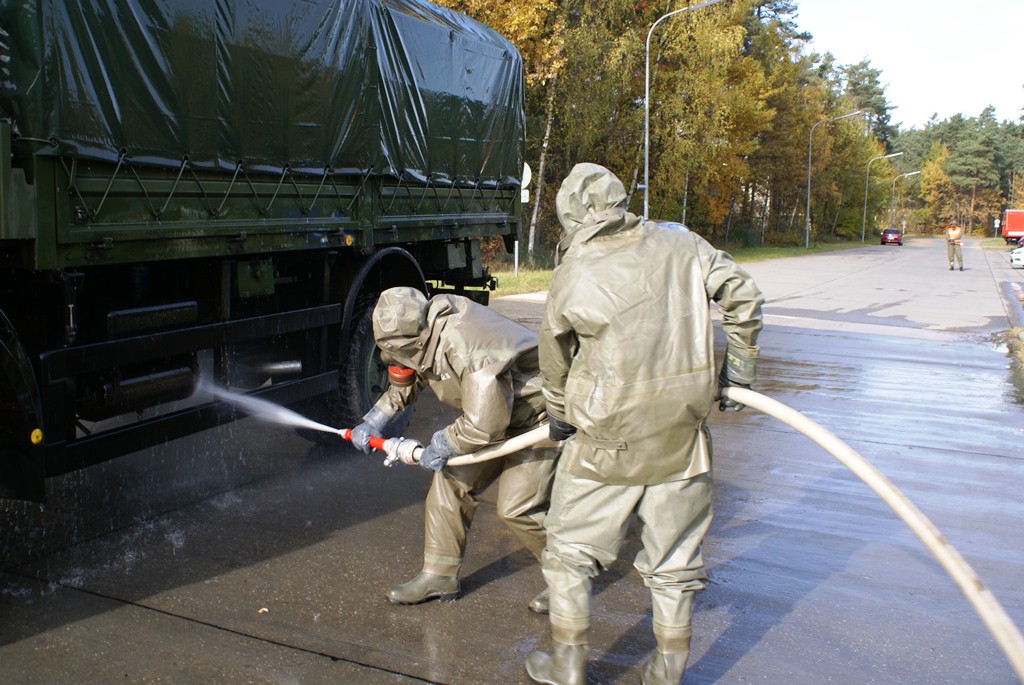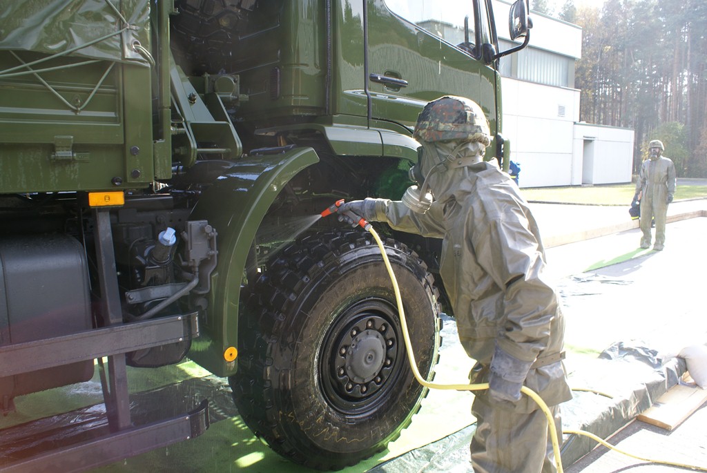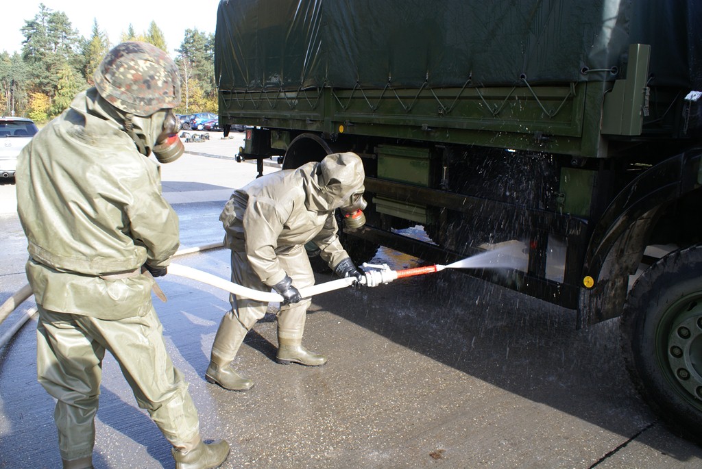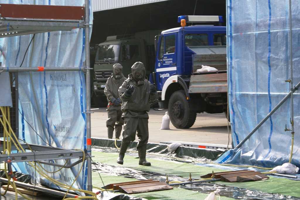 Aus diesem Sachverhalt heraus hat sich die Arbeitsgemeinschaft (AG) ABC-Schutz mit dem THW zusammengetan und in einer gemeinsamen Übung den Aufbau aber vor allem den Betrieb der Dekontaminationsschleuse für Fahrzeuge geübt. Im Grunde unterscheidet sich die Dekontaminationsschleuse nicht wesentlich von Einrichtungen der Bundeswehr. Der Betrieb war daher für die Soldaten auch nichts Ungewöhnliches.