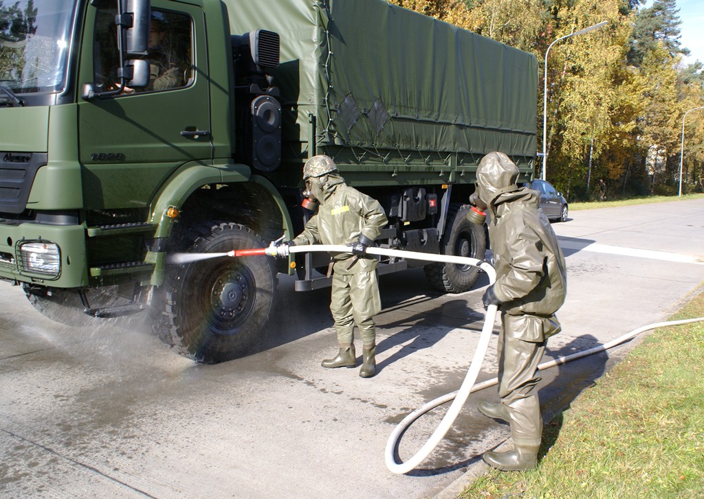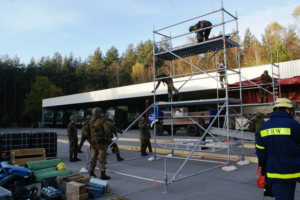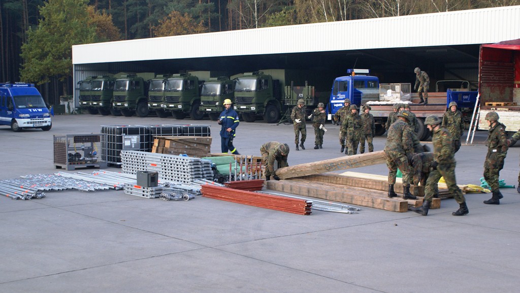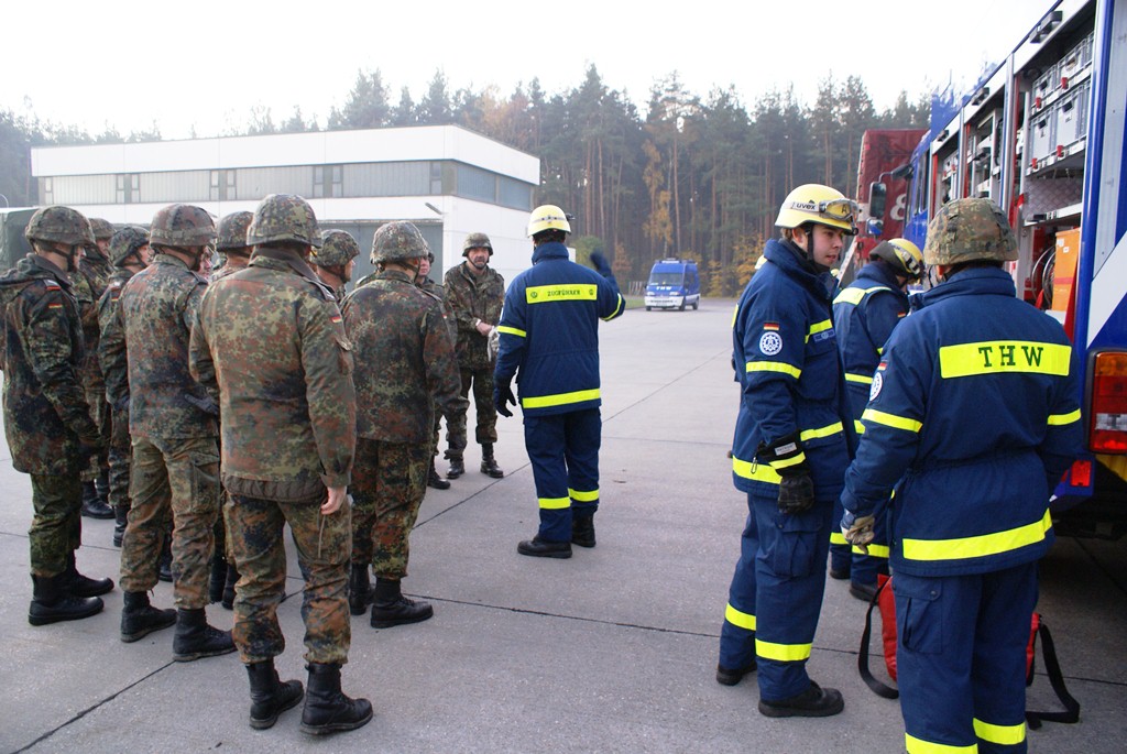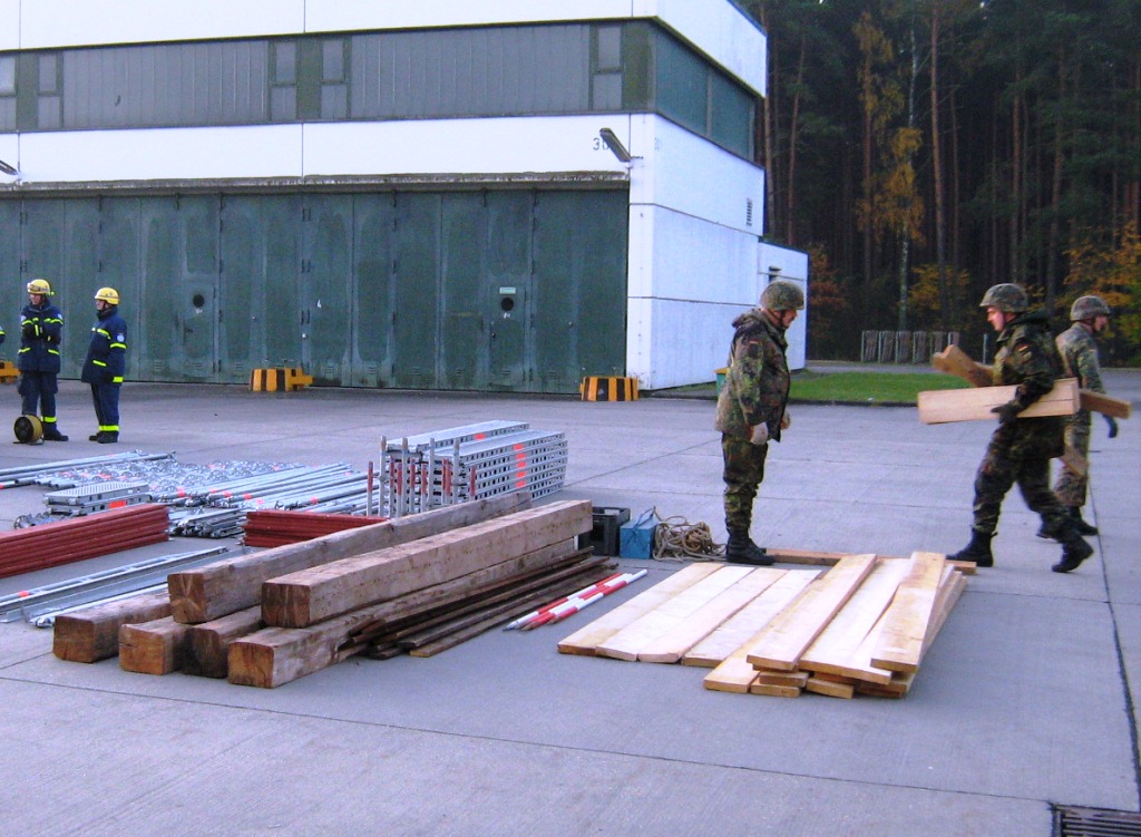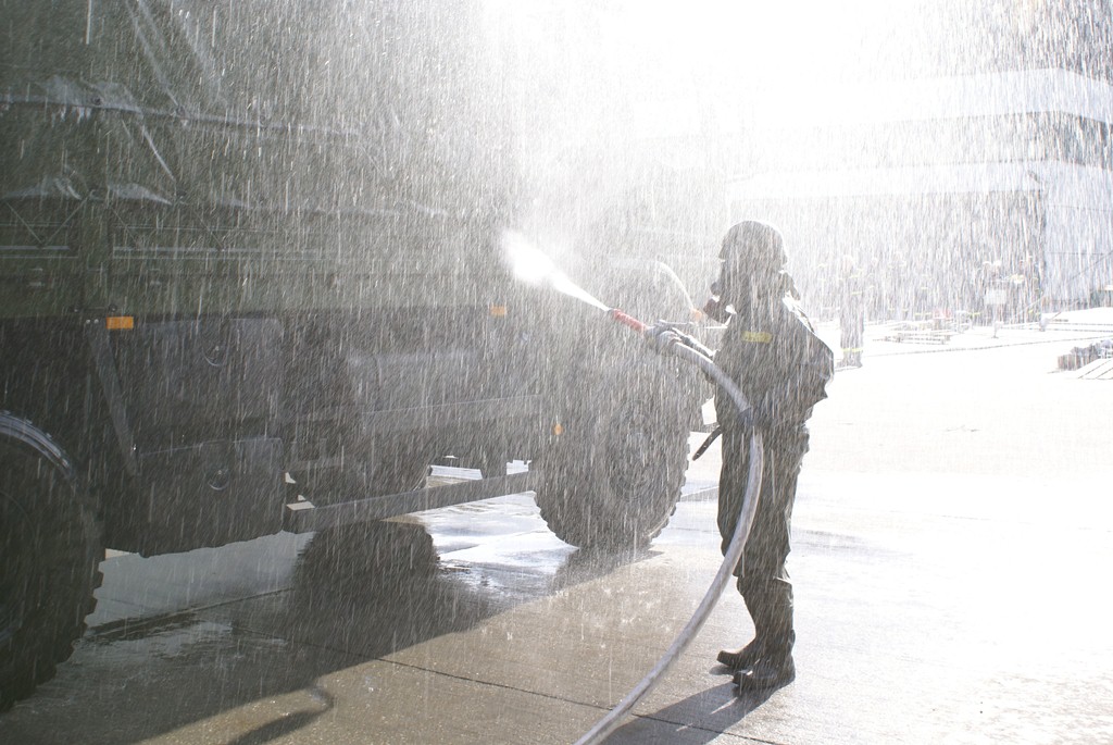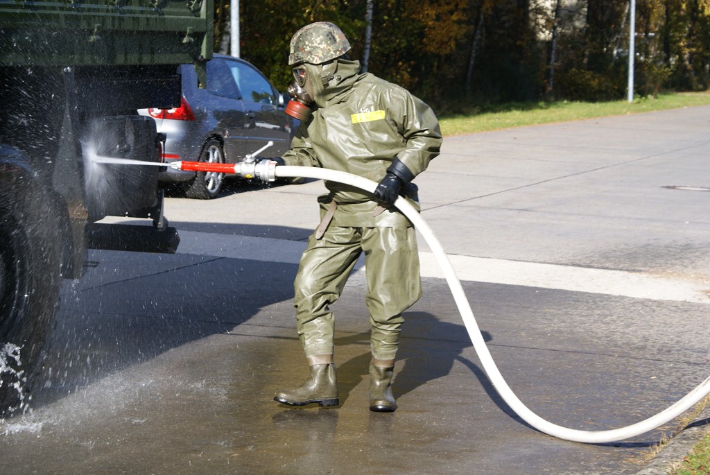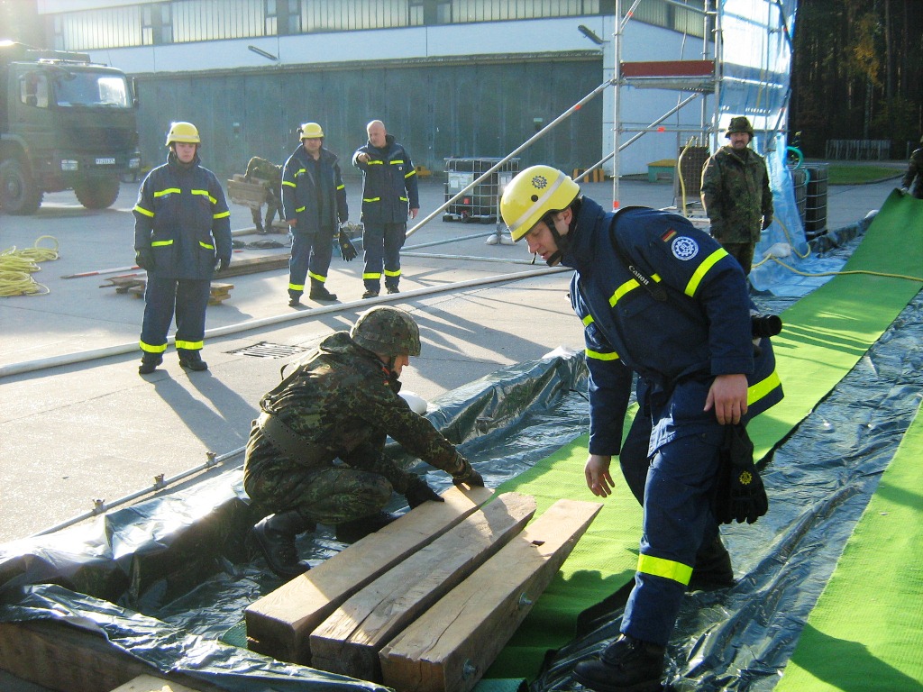 Aus diesem Sachverhalt heraus hat sich die Arbeitsgemeinschaft (AG) ABC-Schutz mit dem THW zusammengetan und in einer gemeinsamen Übung den Aufbau aber vor allem den Betrieb der Dekontaminationsschleuse für Fahrzeuge geübt. Im Grunde unterscheidet sich die Dekontaminationsschleuse nicht wesentlich von Einrichtungen der Bundeswehr. Der Betrieb war daher für die Soldaten auch nichts Ungewöhnliches.