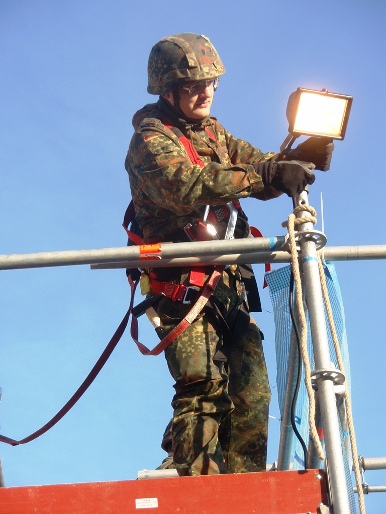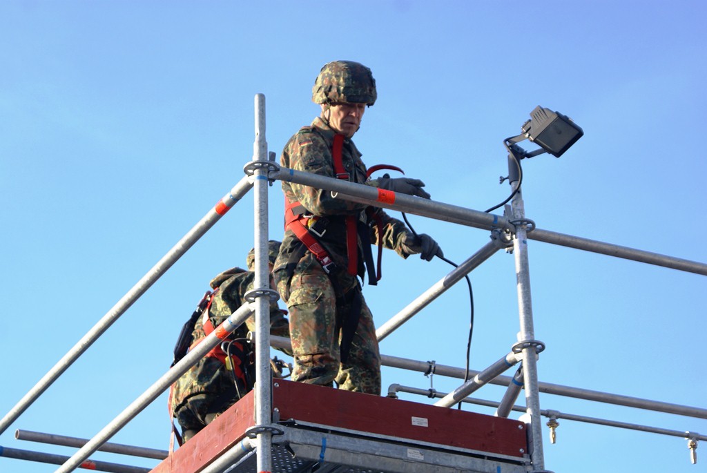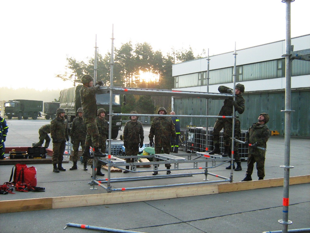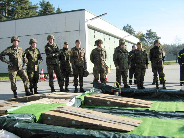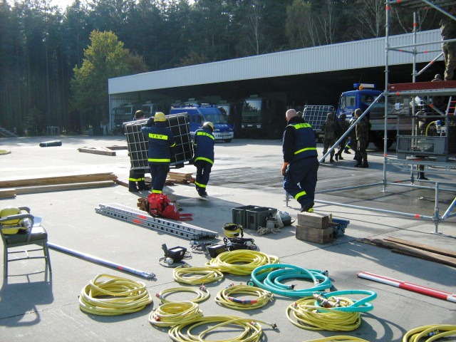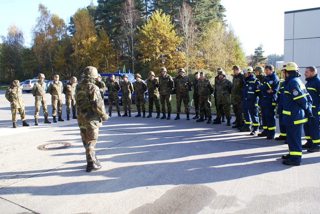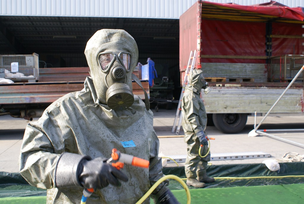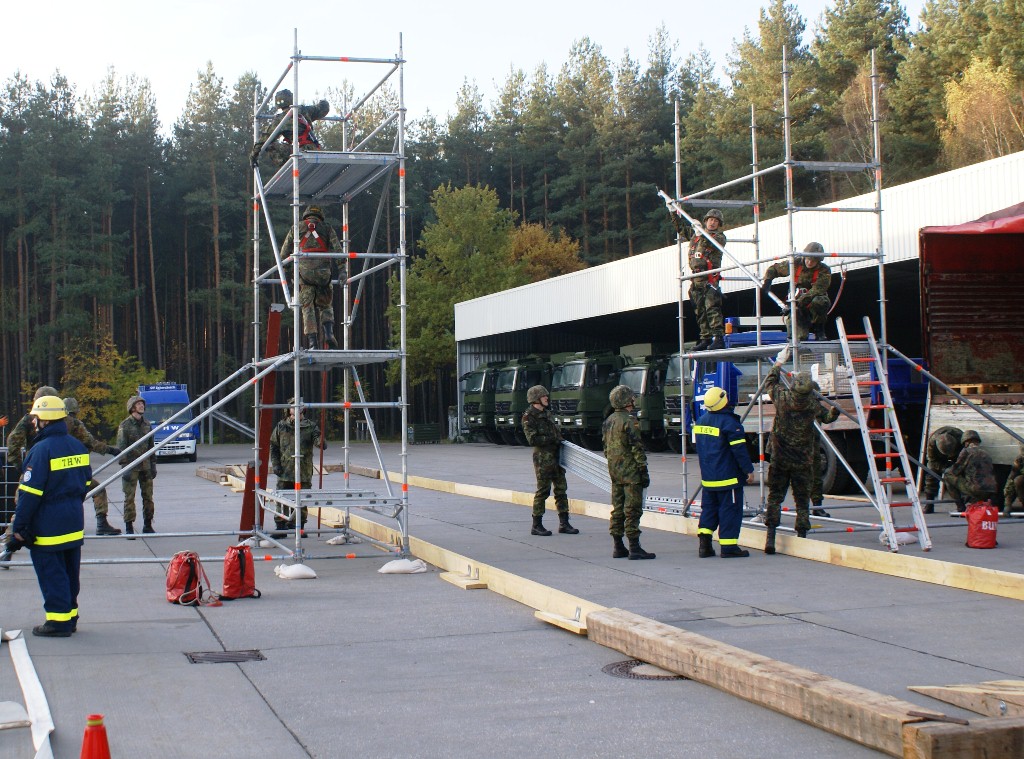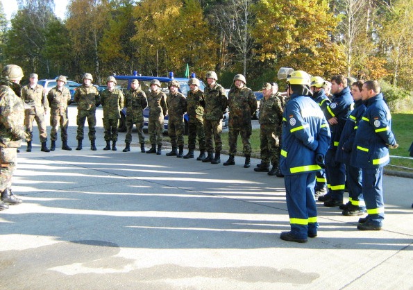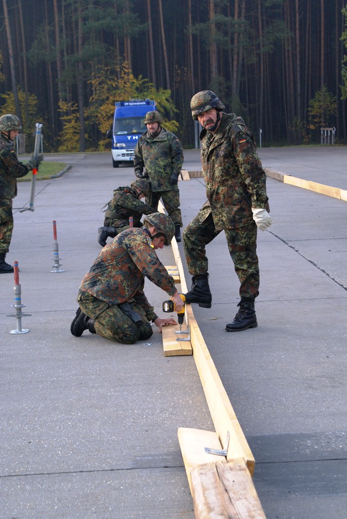 Aus diesem Sachverhalt heraus hat sich die Arbeitsgemeinschaft (AG) ABC-Schutz mit dem THW zusammengetan und in einer gemeinsamen Übung den Aufbau aber vor allem den Betrieb der Dekontaminationsschleuse für Fahrzeuge geübt. Im Grunde unterscheidet sich die Dekontaminationsschleuse nicht wesentlich von Einrichtungen der Bundeswehr. Der Betrieb war daher für die Soldaten auch nichts Ungewöhnliches.