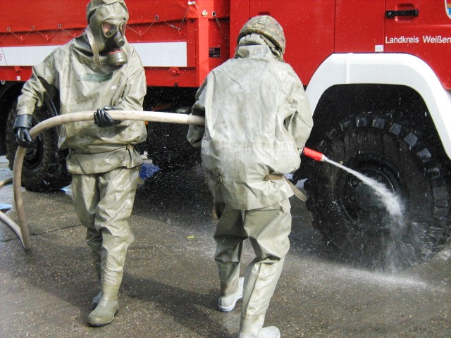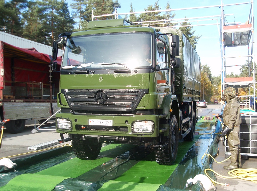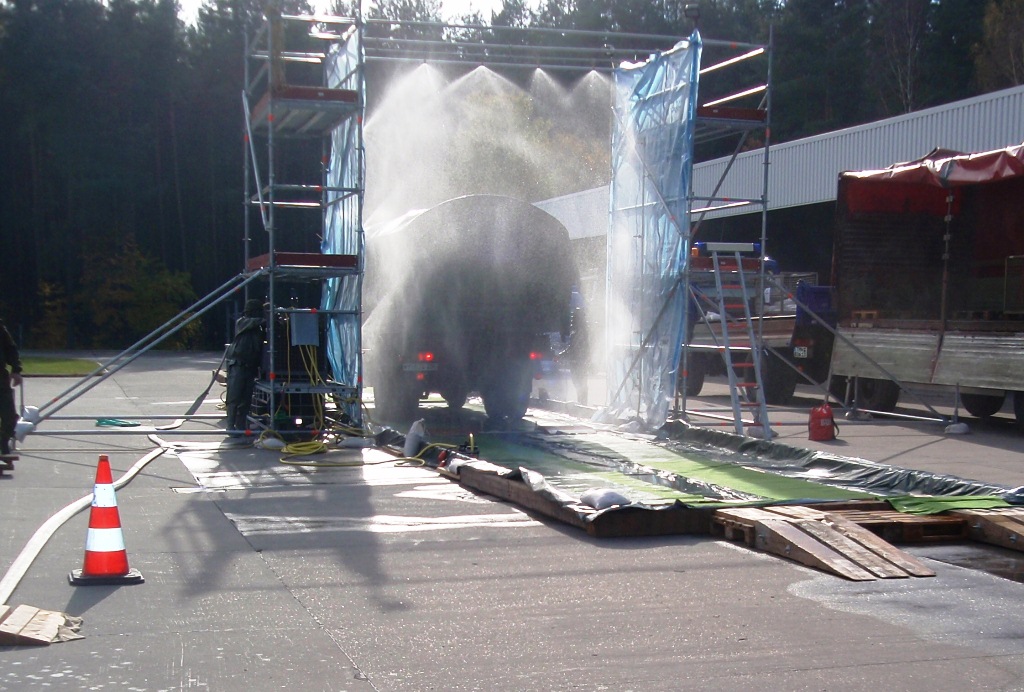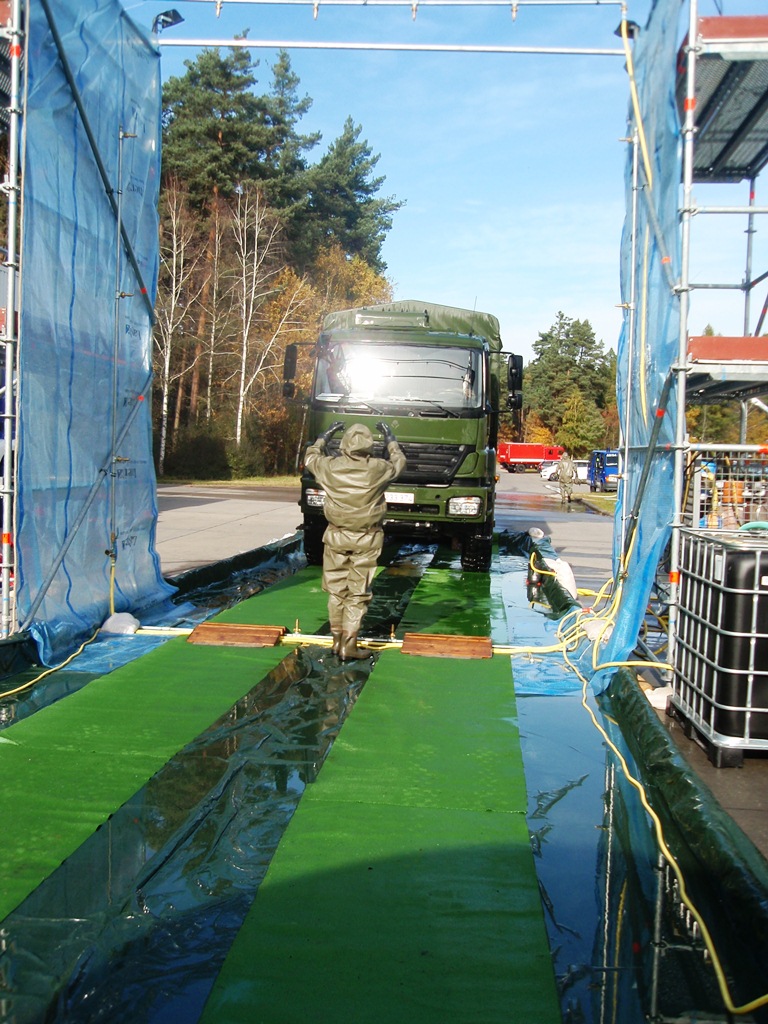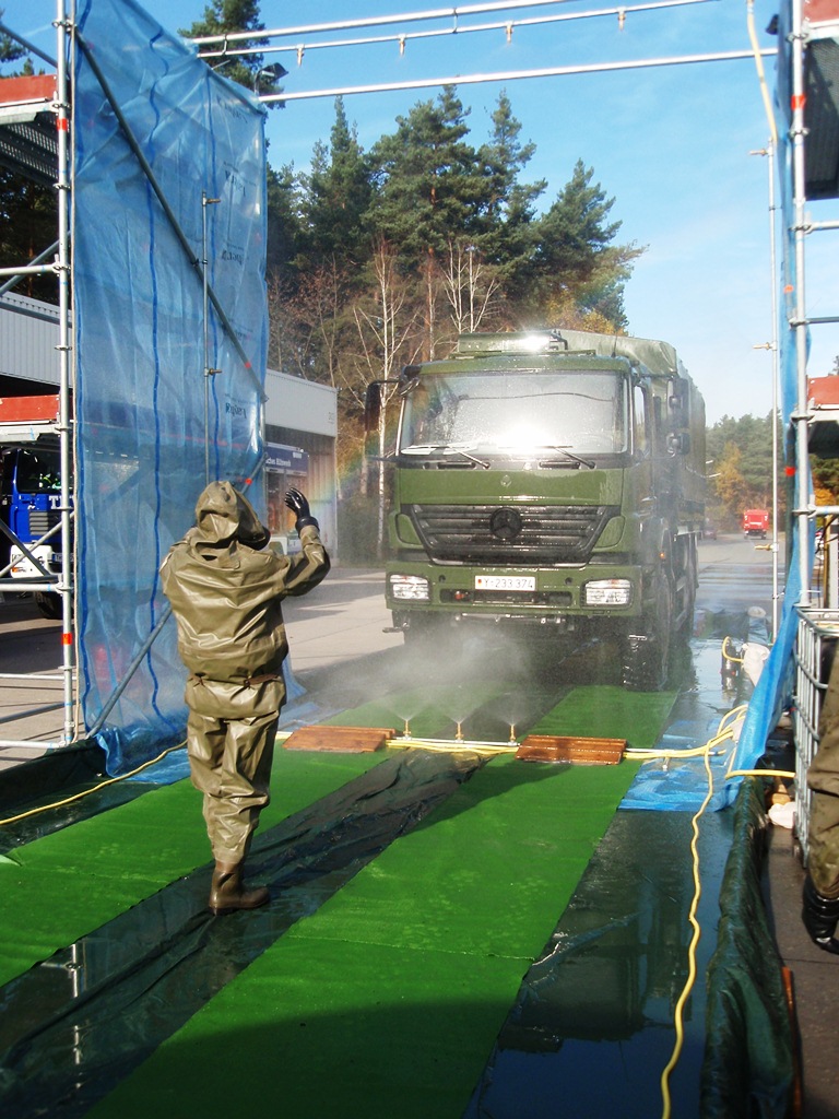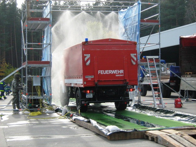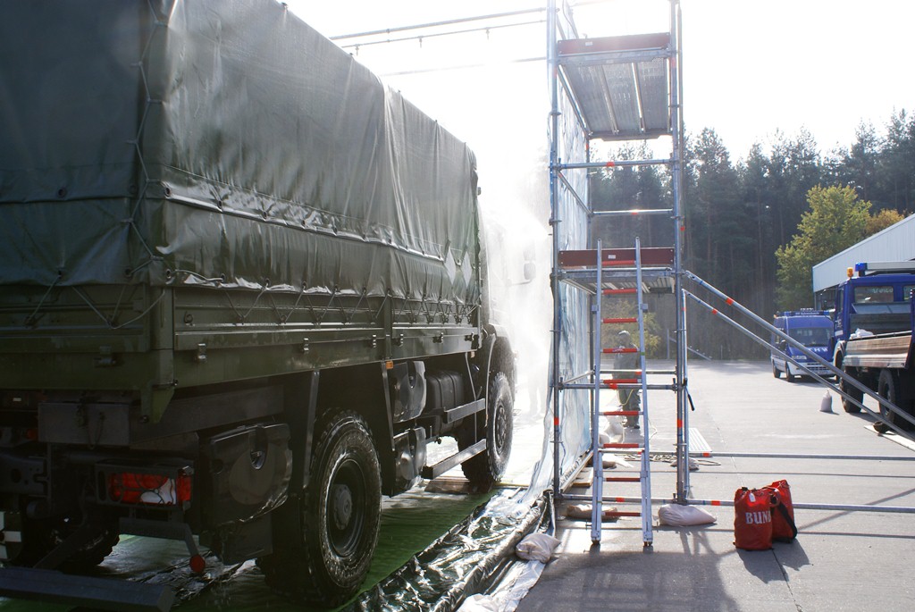 Kommt es zu Kontaminationen von Fahrzeugen - wie zum Beispiel bei der Vogelgrippe - ist zuerst die Feuerwehr oder das THW gefragt. In der Region Nürnberg besitzt das THW Schwabach eine Einrichtung zur Dekontamination von Fahrzeugen. Das THW ist dabei nur für den Aufbau verantwortlich, den Betrieb müssen andere übernehmen.