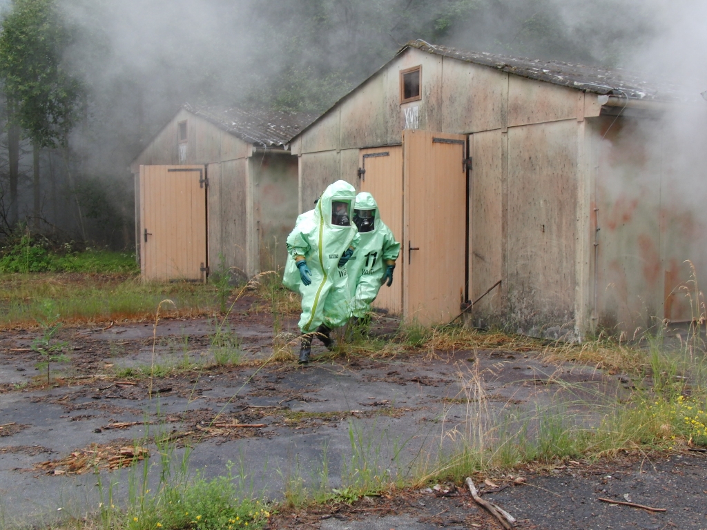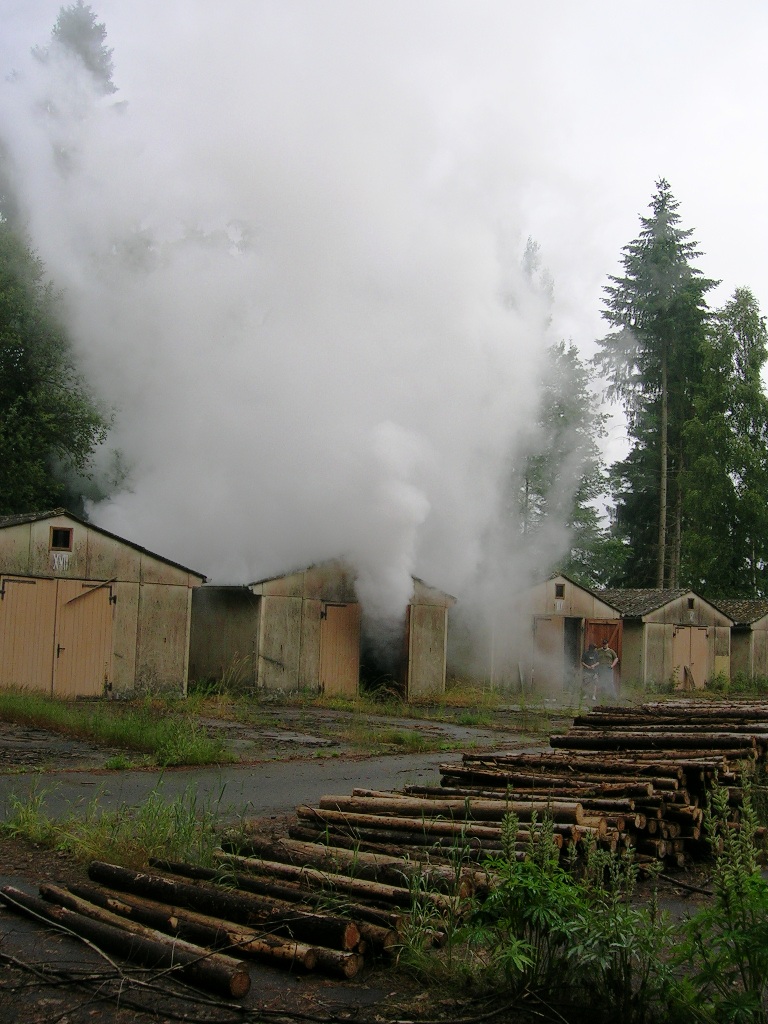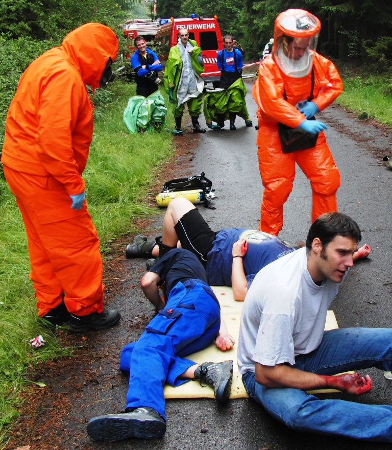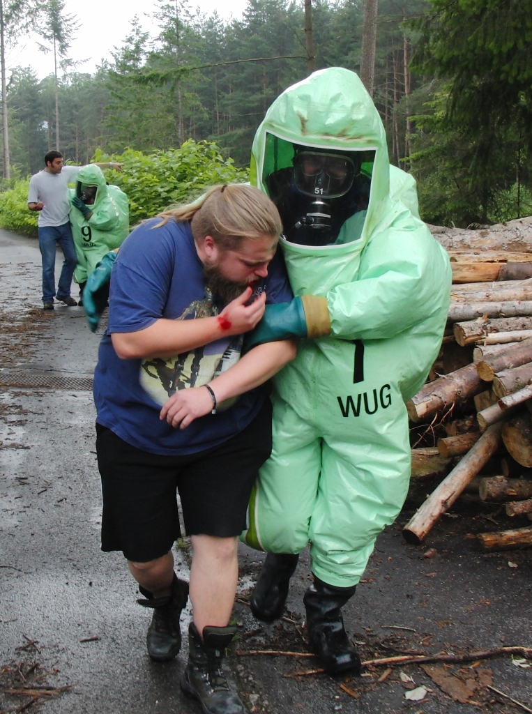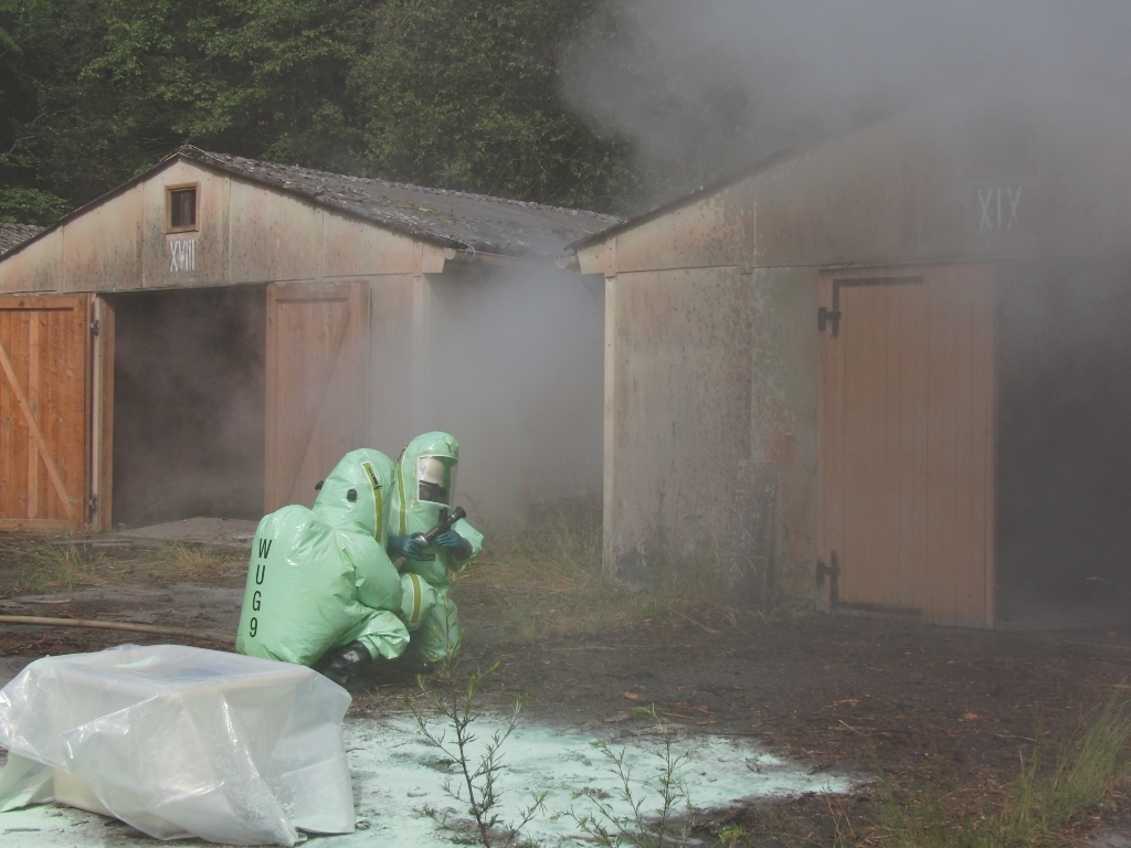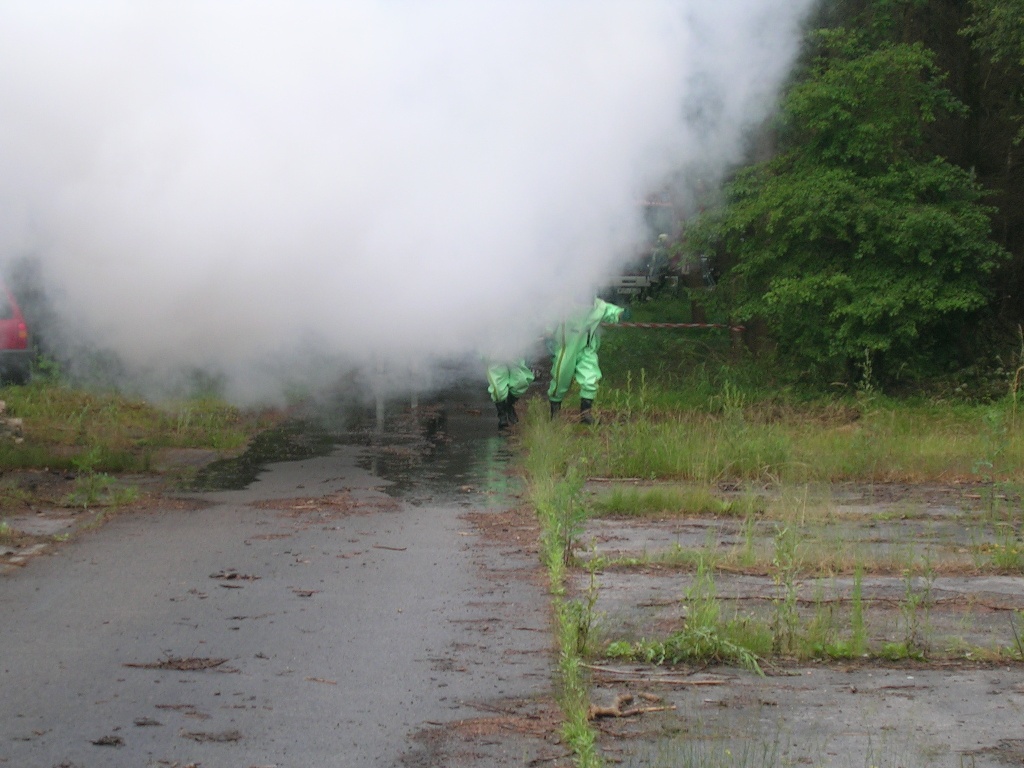 Zurück zum Ausgang: Eines Morgens kurz nach acht Uhr ziehen stechend riechende Dämpfe aus dem Waldstück bei Langlau auf den Ort und das Naherholungsgebiet Brombachsee zu. Um 08.30 Uhr ging in der Notrufzentrale die Meldung ein, dass Fässer mit Chemikalien in Brand geraten sind. Die örtlichen Feuerwehren wurden zur Absicherung und der Gefahrgutzug der Feuerwehr Weißenburg wurde zum Einsatz an der Schadensstelle alarmiert. Beim Eintreffen kamen den Feuerwehrleuten zwei Arbeiter entgegen, die aus der Schadensstelle geflüchtet waren. Sie gaben die Meldung ab, dass neun weitere Arbeiter verletzt bei den brennenden Fässern liegen.