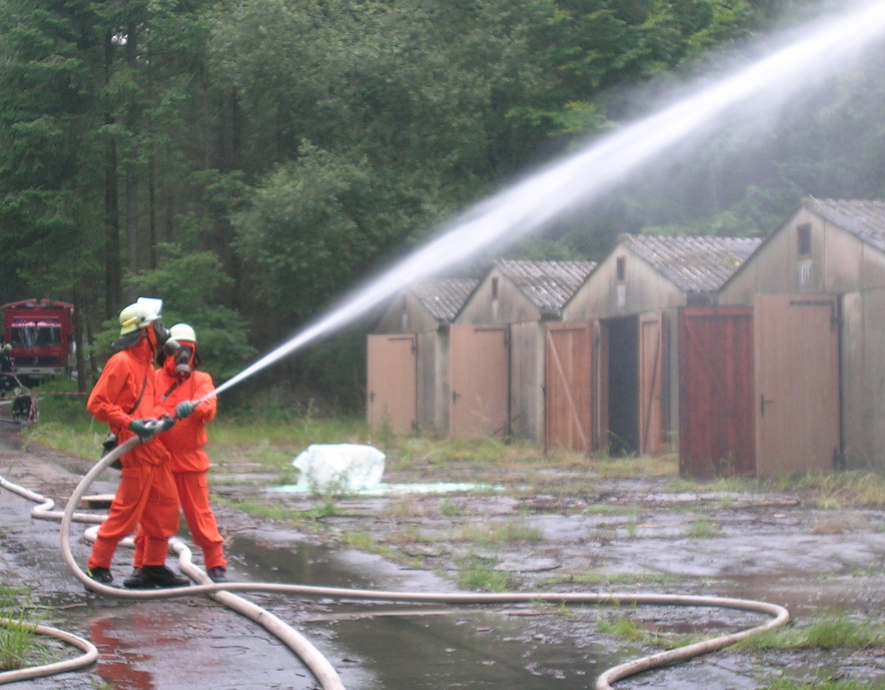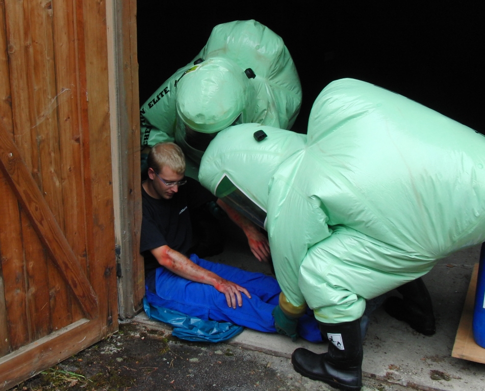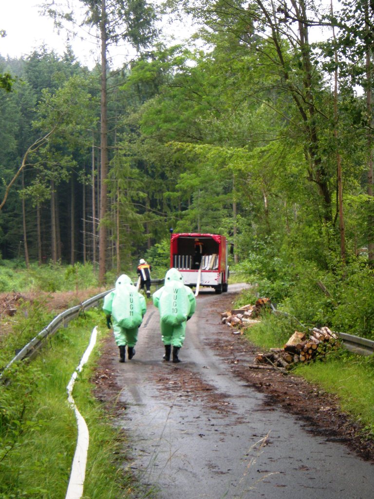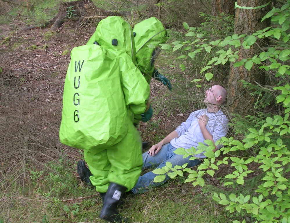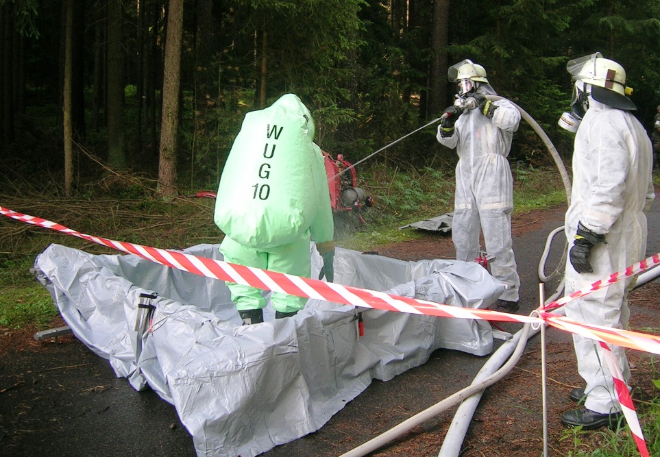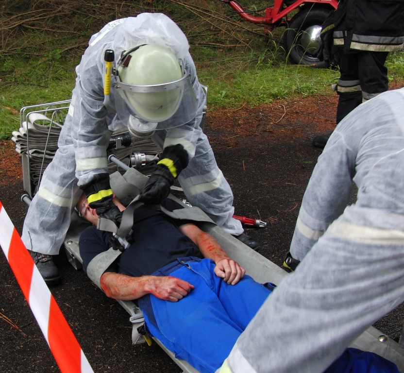 Zurück zum Ausgang: Eines Morgens kurz nach acht Uhr ziehen stechend riechende Dämpfe aus dem Waldstück bei Langlau auf den Ort und das Naherholungsgebiet Brombachsee zu. Um 08.30 Uhr ging in der Notrufzentrale die Meldung ein, dass Fässer mit Chemikalien in Brand geraten sind. Die örtlichen Feuerwehren wurden zur Absicherung und der Gefahrgutzug der Feuerwehr Weißenburg wurde zum Einsatz an der Schadensstelle alarmiert. Beim Eintreffen kamen den Feuerwehrleuten zwei Arbeiter entgegen, die aus der Schadensstelle geflüchtet waren. Sie gaben die Meldung ab, dass neun weitere Arbeiter verletzt bei den brennenden Fässern liegen.