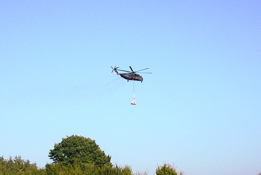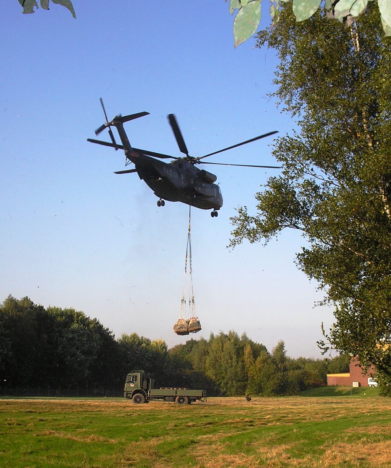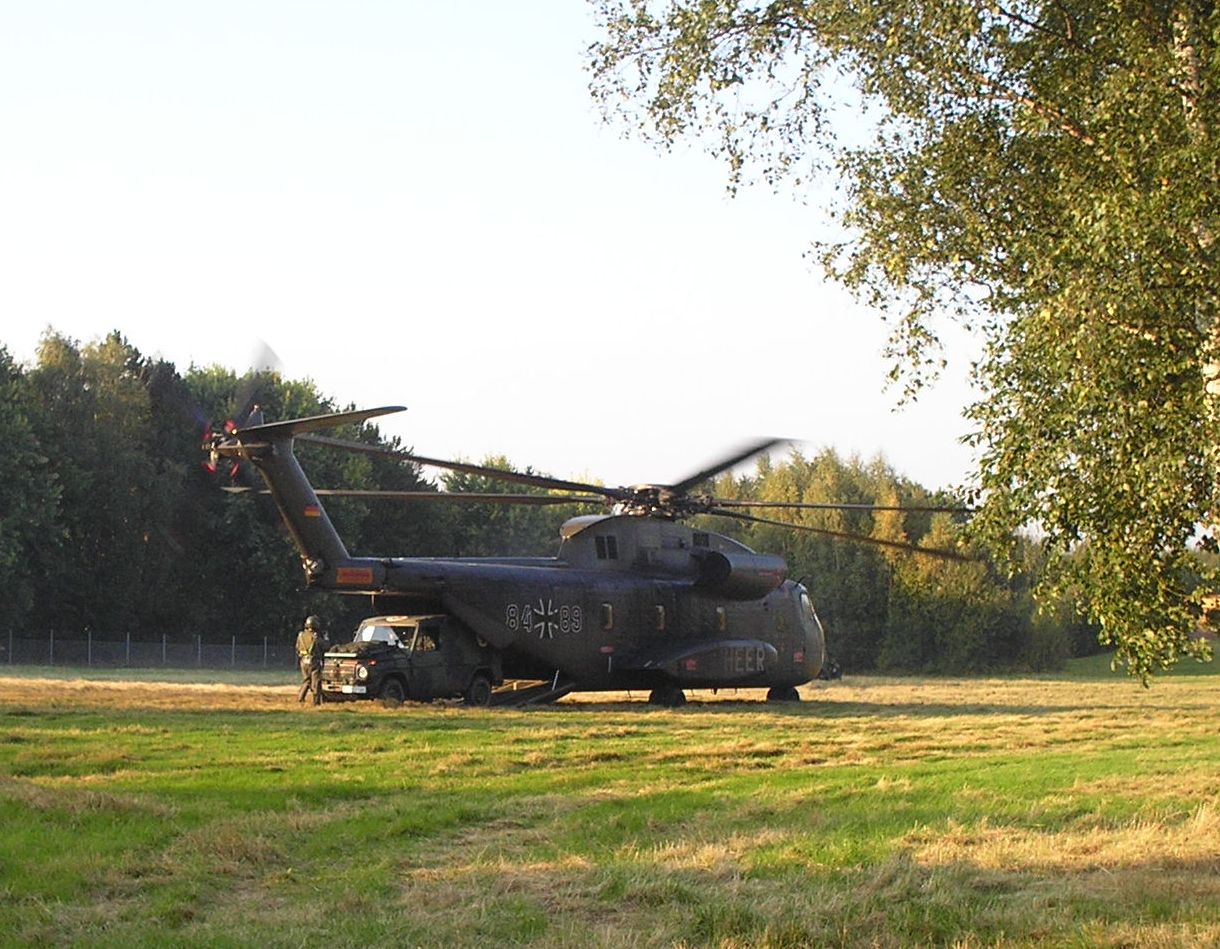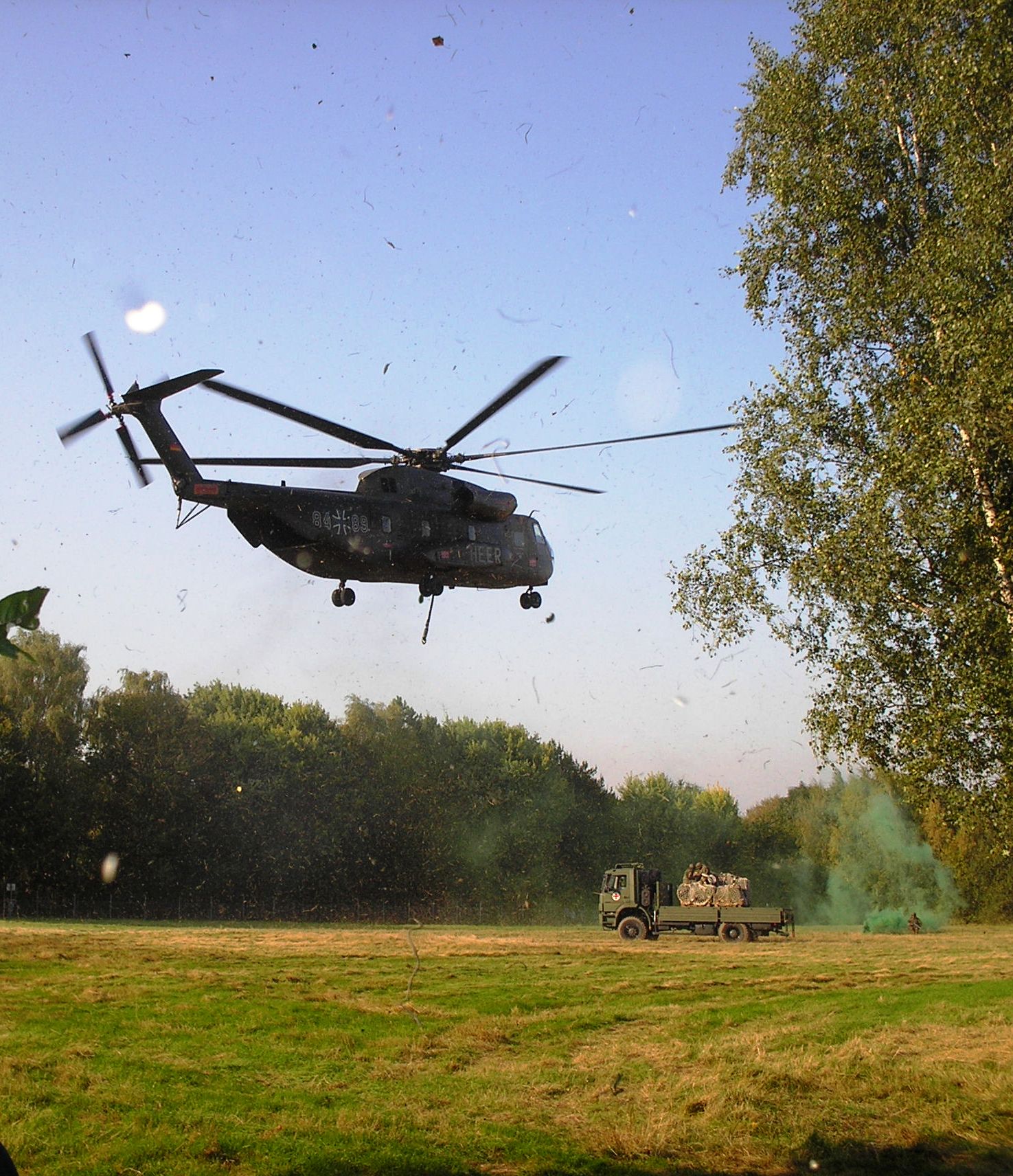 Der Ablauf war eindrucksvoll. Nach dem Absetzen der auf Paletten verlasteten Luftlanderettungsstation ging alles ganz schnell. In etwas über 10 Minuten war die die Rettungsstation aufgebaut und einsatzbereit. Eine Behandlung ähnlich wie in einem Notarztwagen wäre möglich. Bei Bedarf kann aber auch noch ein gepanzerter Sanitäts-Wolf nachgeführt werden. Das "Arbeitstier" mit dem dies alles ermöglicht wird, ist der Transporthubschrauber CH 53.