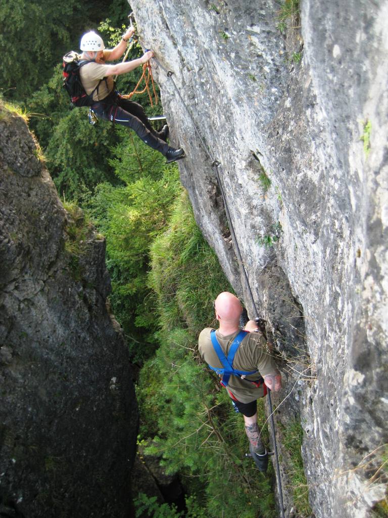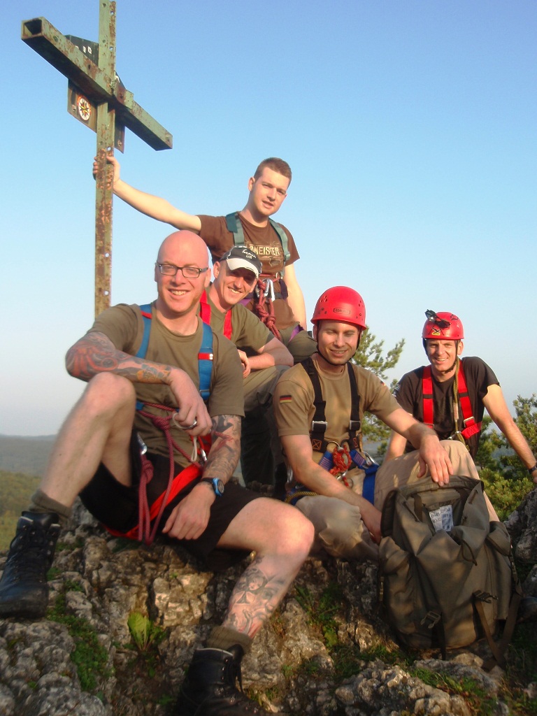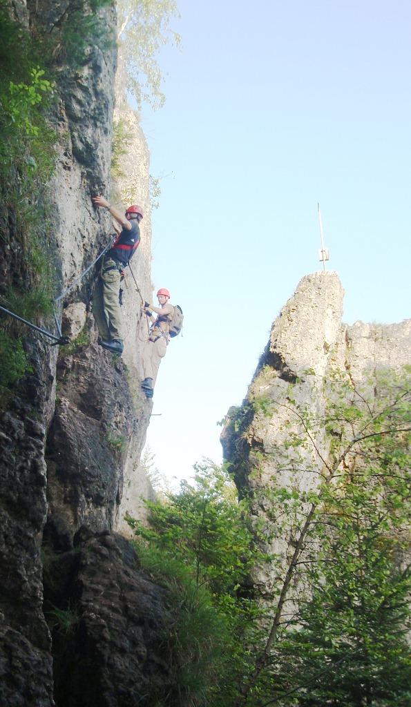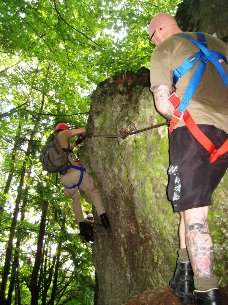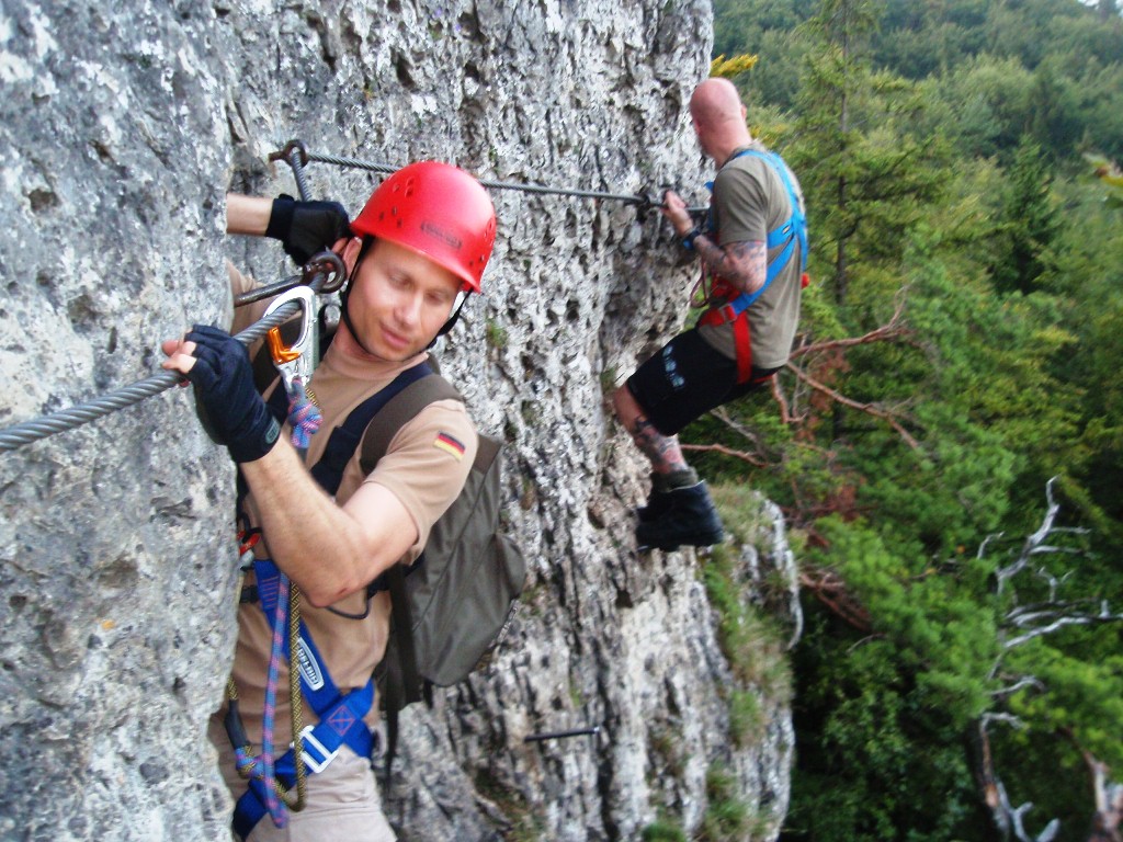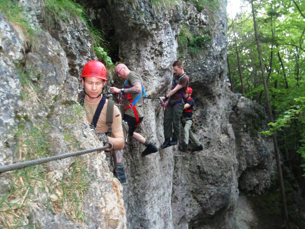 In den Sommermonaten ist dieser immer überlaufen. Zudem sollte der Sonntag sehr heiß werden. Was lag also näher, als in der Morgendämmerung einzusteigen. Es war herrlich, alleine durch den Klettersteig zu gehen und sich bei den einzelnen Stellen nicht immer hinten anzustellen. Die Temperaturen waren auch noch akzeptabel. So konnte die Begehung des Höhenglücksteiges wieder einmal mit den Reservisten der RK Nürnberg erfolgen. Beim Rückmarsch zum Parkplatz kamen uns dann die ersten Wanderer entgegen. Wir waren hier unterwegs zu unserem zweiten Frühstück.