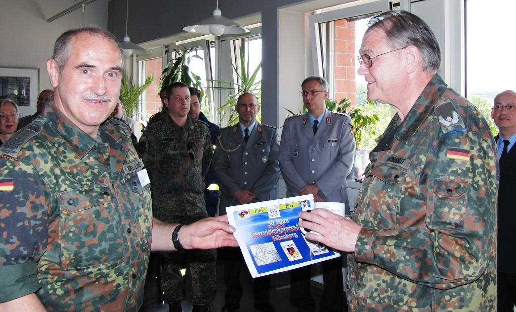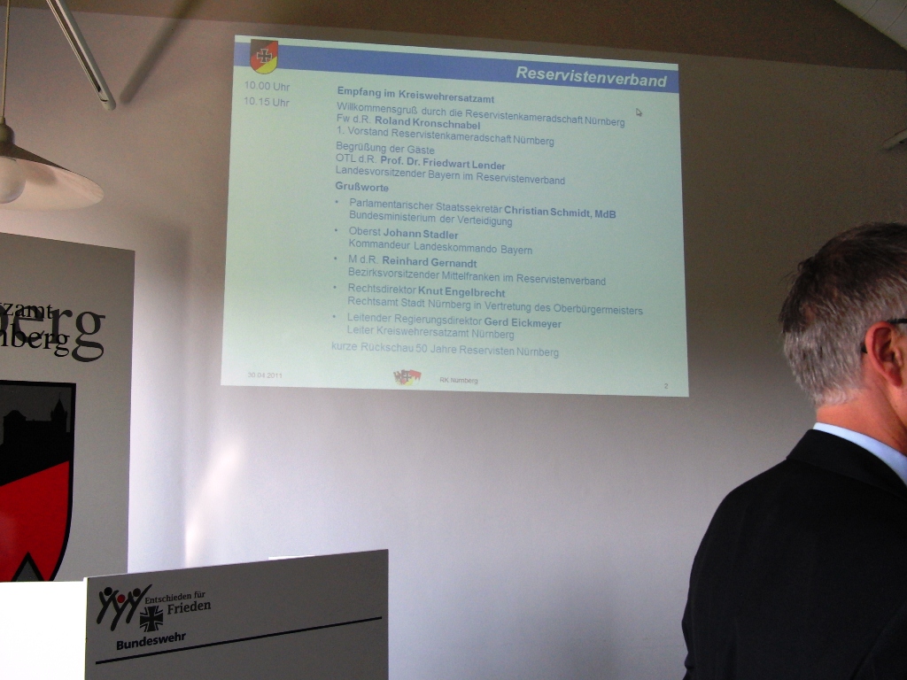 Auch Oberst Johann Stadler, Kommandeur im Landeskommando Bayern ließ es sich nicht nehmen, nach Nürnberg zu kommen und die Leistungen der RK Nürnberg zu würdigen. 50 Jahre Reservistenarbeit in Nürnberg sei geprägt durch die Aktivitäten der RK Nürnberg. Gerade die RK Nürnberg sei es auch, die sich überregional einbringt und in der Reservistenarbeit Maßstäbe setzt.