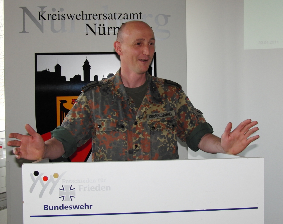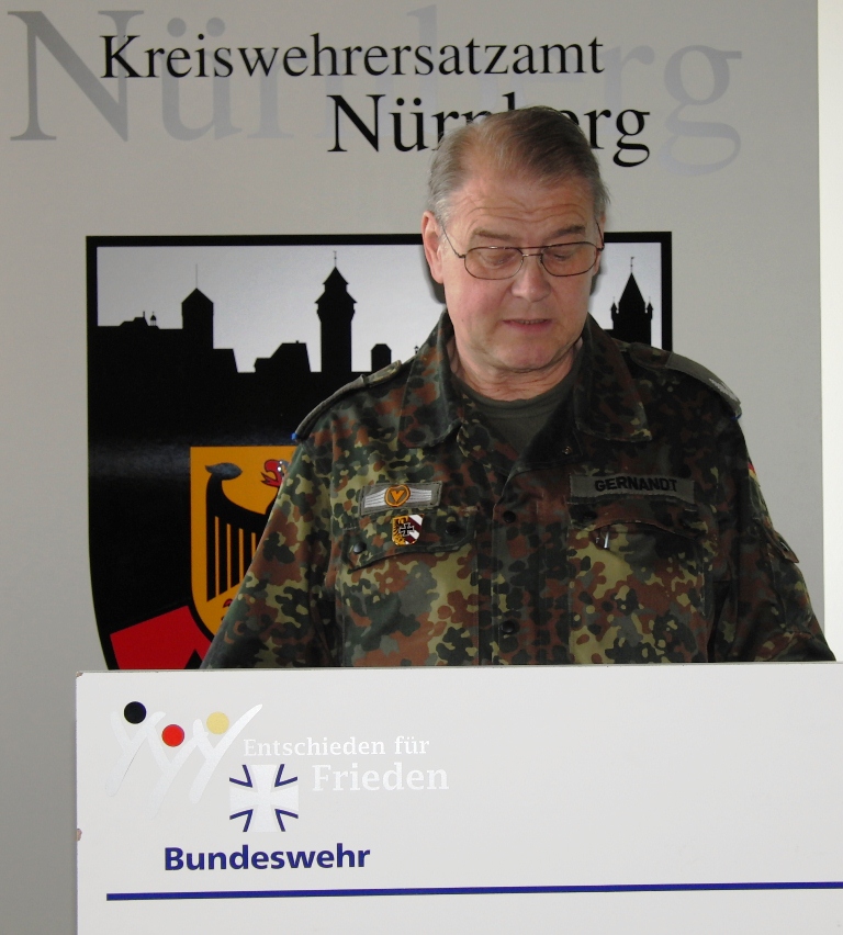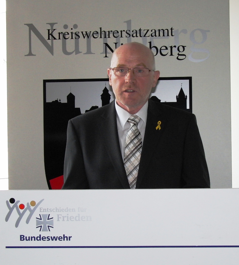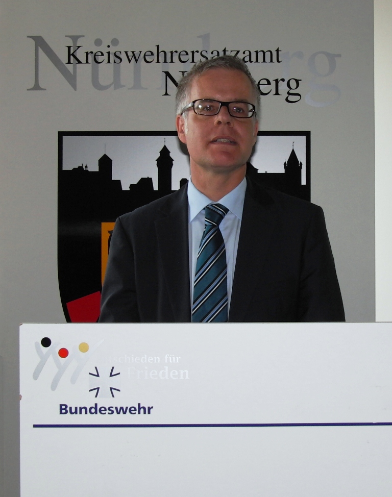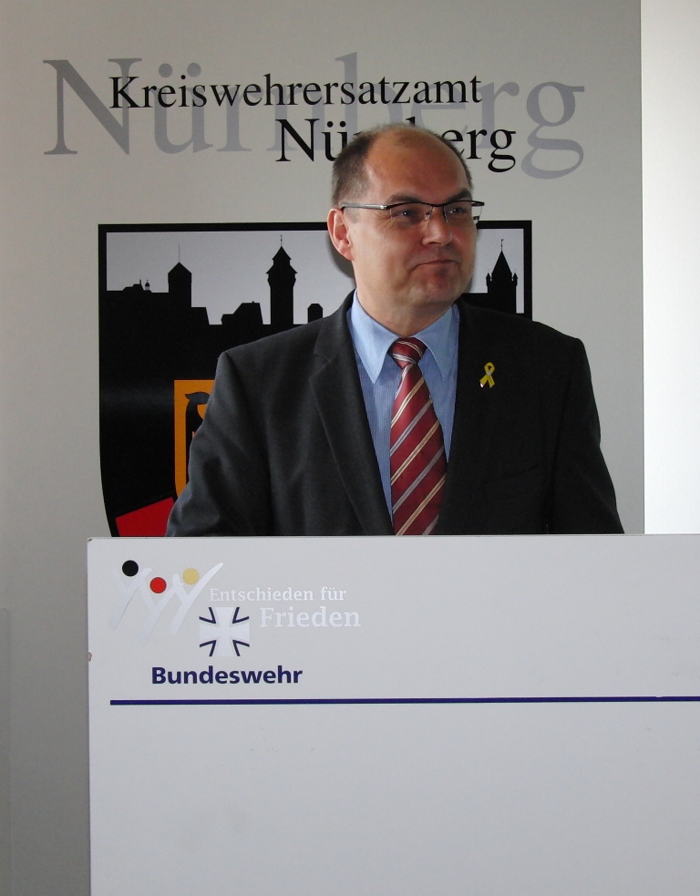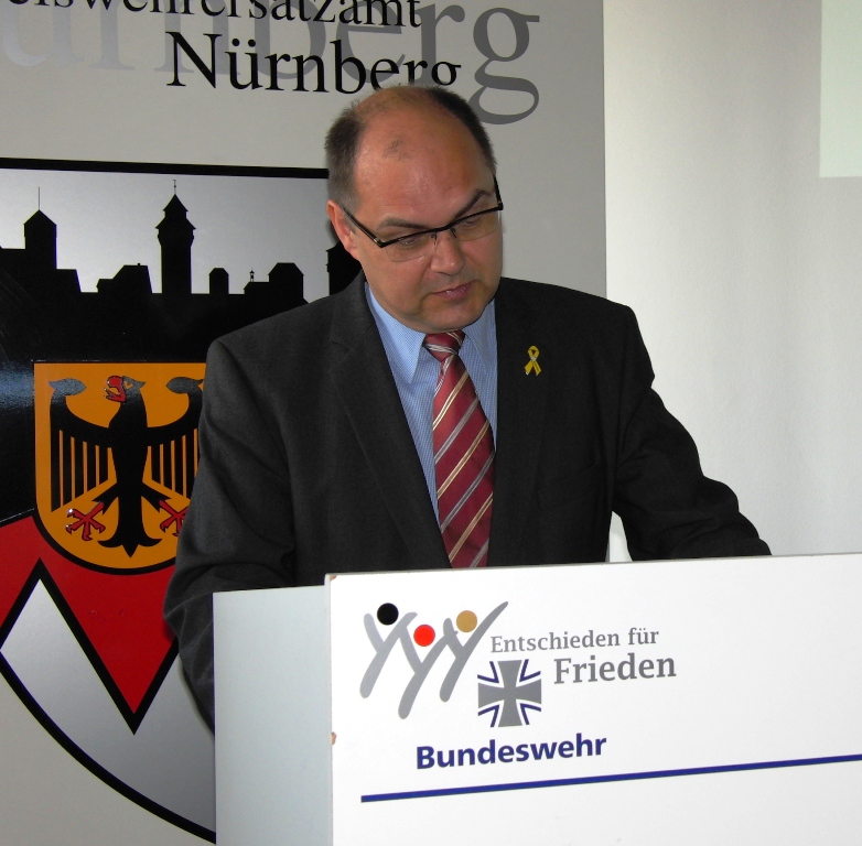 Leitender Regierungsdirektor Gerd Eickmeyer, Leiter des Kreiswehrersatzamtes Nürnberg und Vorsitzender der Sektion Nürnberg-Fürth in der Gesellschaft für Wehr- und Sicherheitspolitik betonte ebenfalls die veränderte Rolle der Wehrverwaltung. Nicht mehr „Abwicklung“ der Wehrpflichtigen sondern mehr Interesse wecken für den freiwilligen Wehrdienst wird zukünftig die Aufgabe sein.