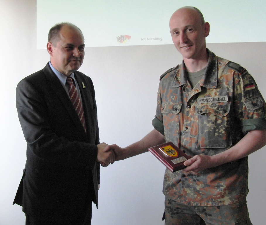 Von der Partnereinheit der US Army, zu der die RK Nürnberg nun schon seit 1984 partnerschaftliche Beziehungen pflegt, richtete der Landesvorsitzende die besten Glückwünsche des Kompaniechefs der 370th Engineer Company, CPT Brian T. Looney aus, da sich die Einheit derzeit noch im Einsatz in Afghanistan befindet.