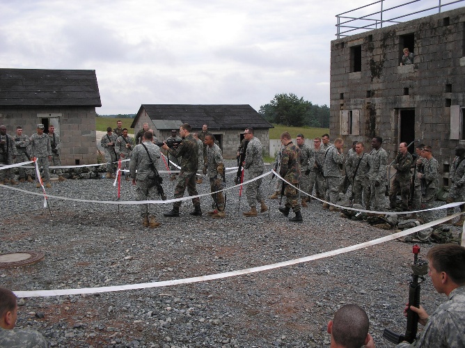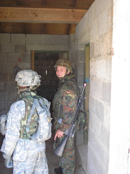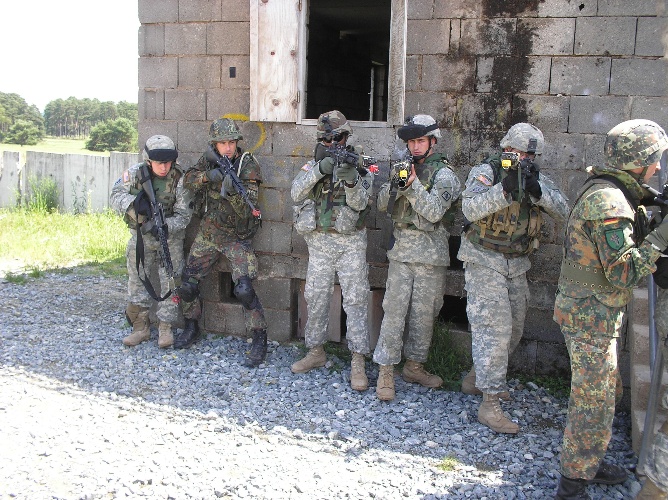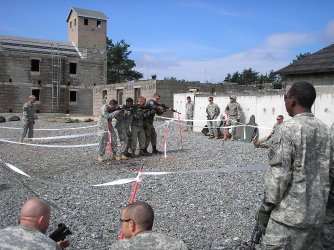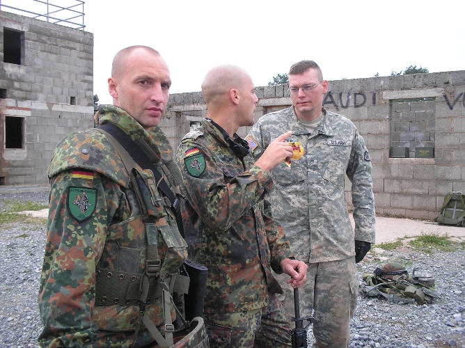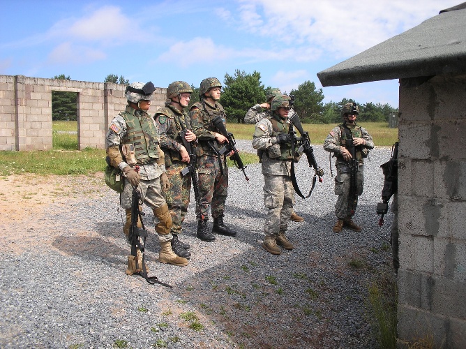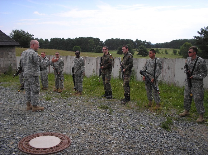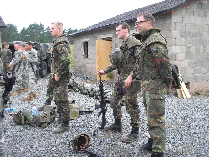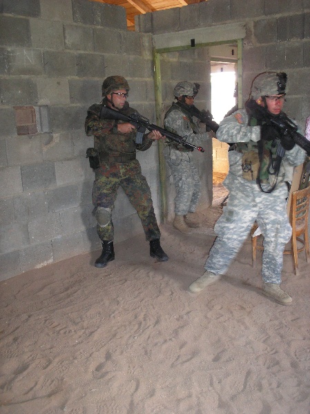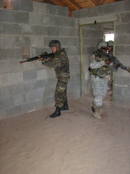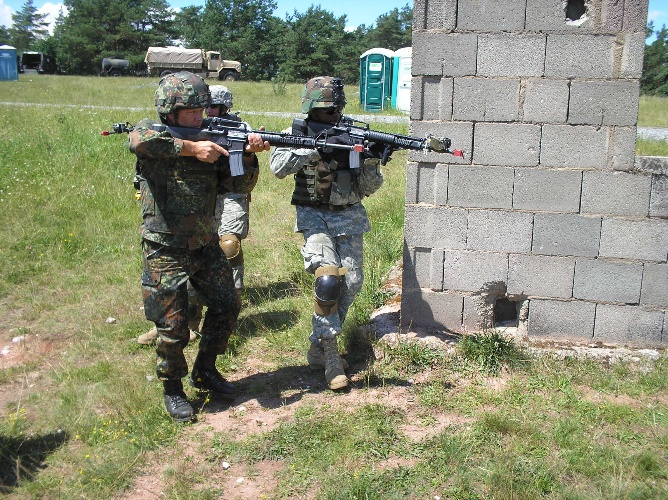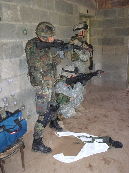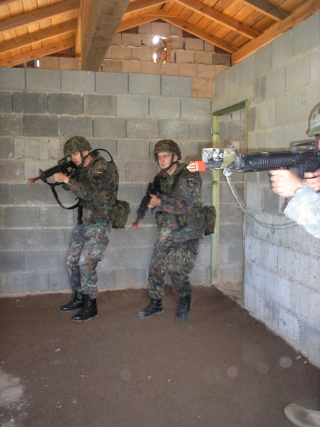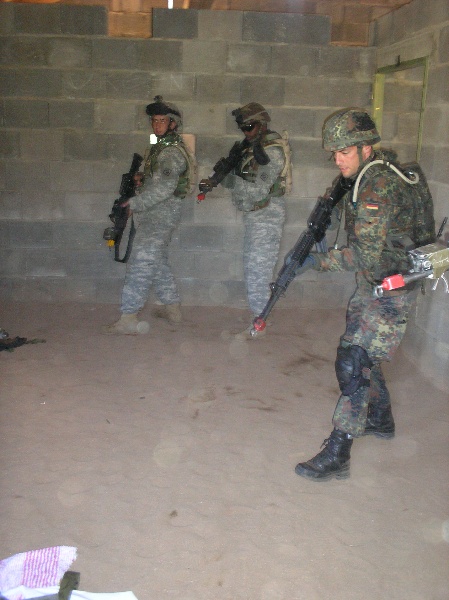 Der ehemalige Orts- und Häuserkampf hat sich in Zeiten von Stabilisierungseinsätzen doch deutlich verändert, auch das Vorgehen im Gebäude. Unsere Kameraden konnten bei der Basisausbildung unserer Pateneinheit dabei sein und den SOP (Standard Operation Procedure) der US Army kennen lernen. Für alle die dabei waren, zwar ein sehr anstrengender Tag, aber ein sehr lehrreicher Tag. Schon das dauerhafte Tragen des Splitterschutzes und des Gefechtshelmes war für viele gewöhnungsbedürftig, beim MOUT-Training im Gebäude aber mit einer ballistischen Brille jedoch Pflicht.