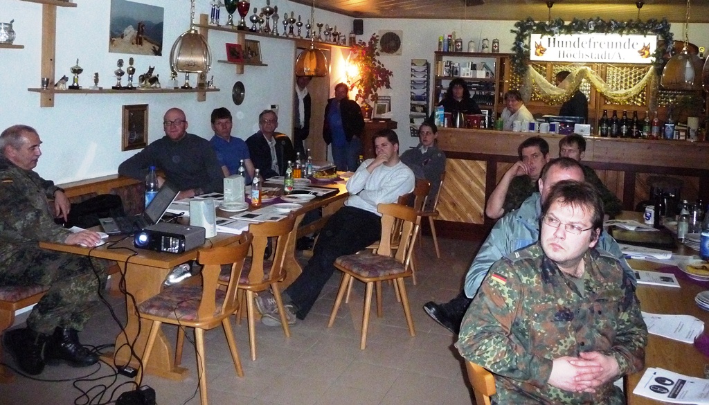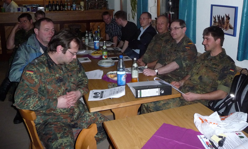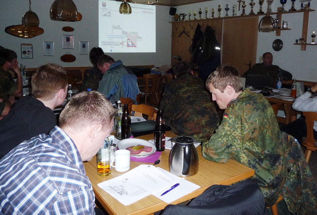 Die Ausbildung in Retten und Bergen von Verschütteten ist Bestandteil der Selbstschutzausbildung der Bundeswehr. Neben den einfachen Mitteln - wie Klopfzeichen und Rufen - kommen aber auch Suchhunde zum Einsatz, um Verschüttete zu orten. Zur Vorbereitung der praktischen Übung zum Retten und Bergen im Mai wurde ein Grundsatzunterricht zu den Rettungsverfahren und eine Einweisung im Suchen mit Hilfe von Rettungshunden durchgeführt.
