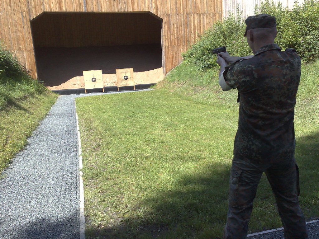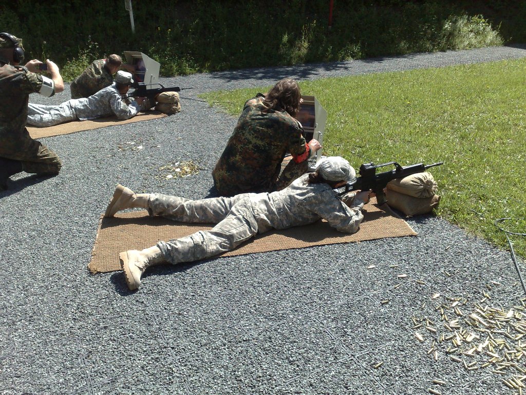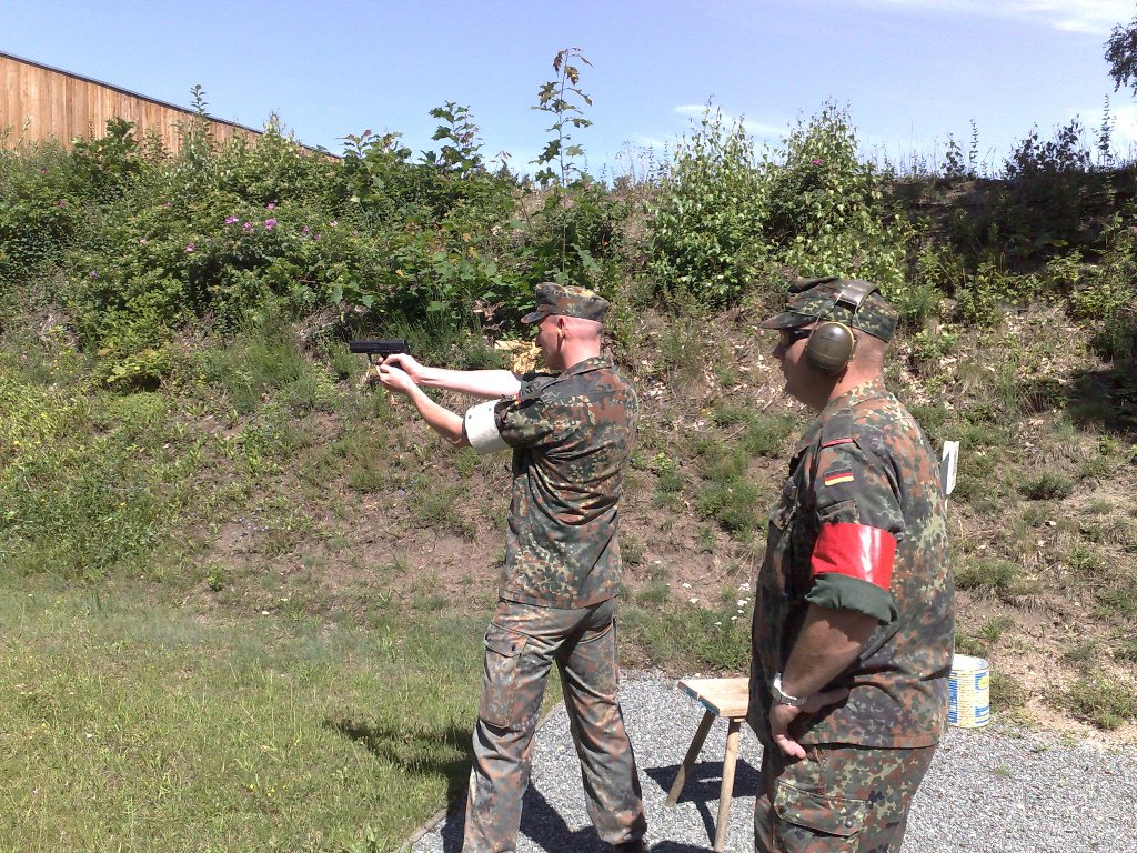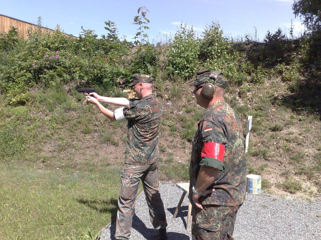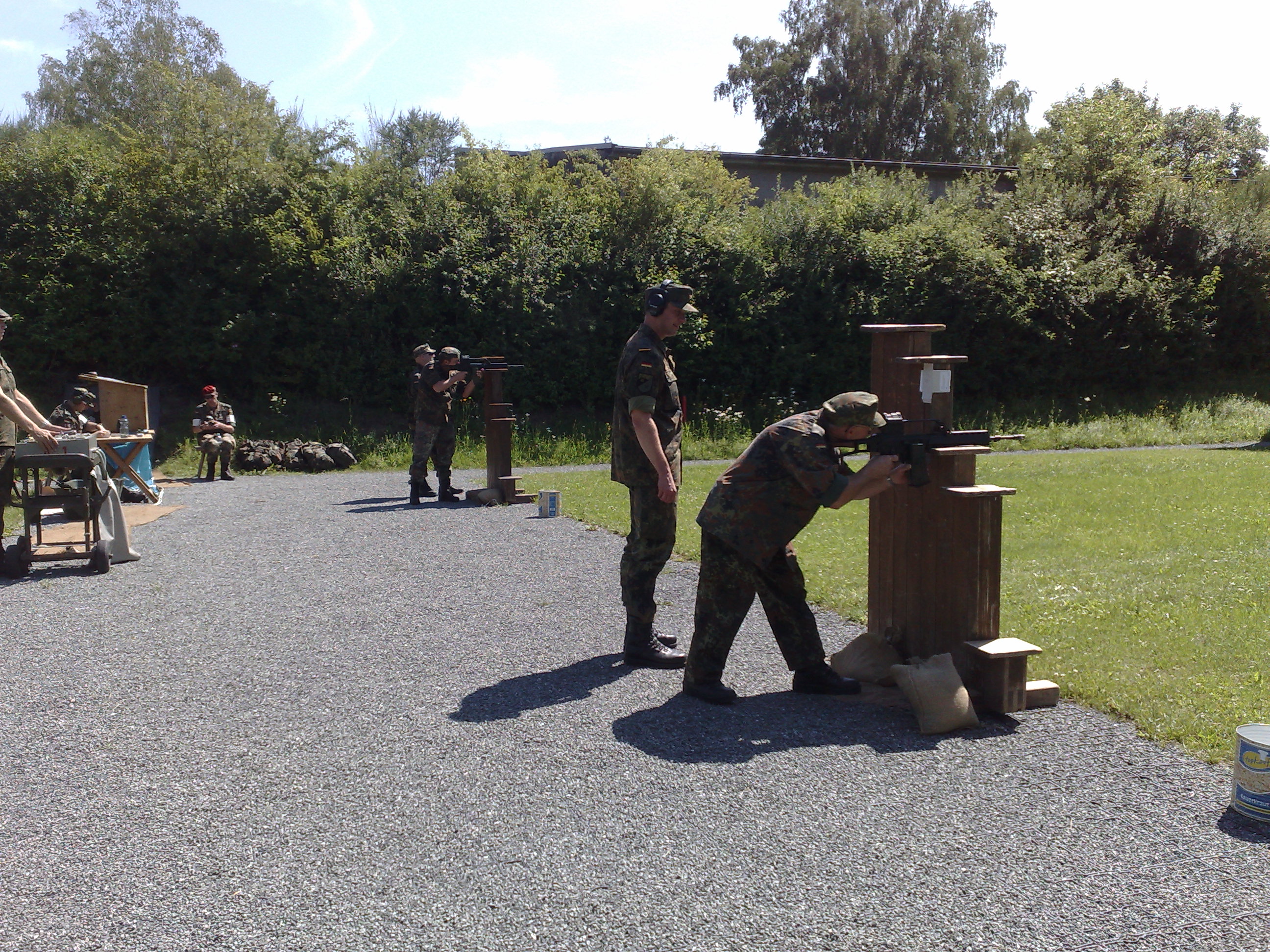 Beim Ausbildungstag mit Schießen standen als Schießübungen Übungen mit der Pistole P8 und dem Gewehr G36 auf dem Programm. Vor allem die für viele Reservisten noch neue Übung G36-S-9 mit verschiedenen Entfernungen bereitete Anfangs Probleme mit der Erfüllung der Leistungen. Im Laufe des Tages besserten sich die Ergebnisse. Hier zeigte sich einfach, dass die Reservisten in der Vergangenheit nur in Ausnahme mit dem G36 geschossen haben und immer noch auf das G3 zurückgreifen mussten.