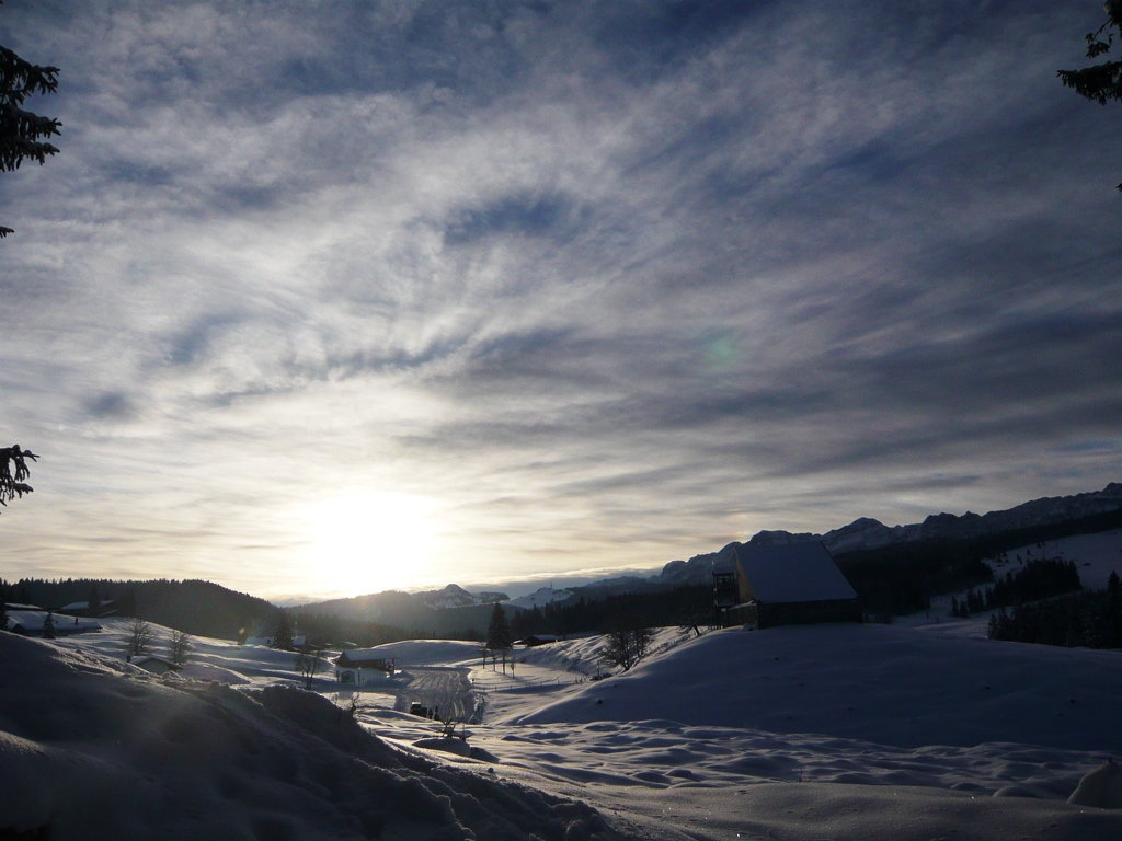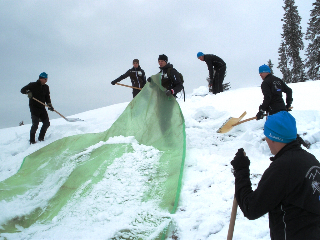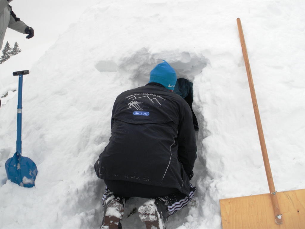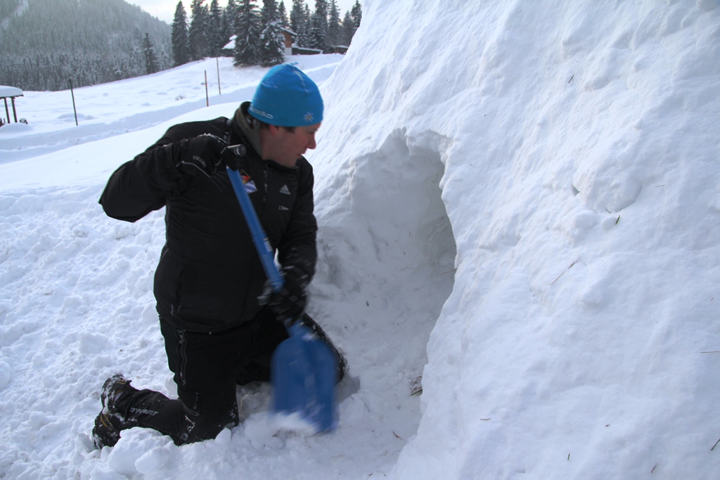 Den Höhepunkt stellte aber sicher der Bau eines sogenannten Schalungs-Iglus dar. Über einen zentralen "Hohlraum" - hier mit einer Skipyramide verwirklicht - wird meterhoch Schnee aufgeschüttet und festgetreten, bis ein wunderschöner runder Iglu in Halbkugelform entstanden ist. Innen dann noch präpariert, dass 3 Personen problemlos nächtigen können, und schon ist die Schneeunterkunft fertig. Einige Kameraden des Skizuges durften dies dann Nachts auch gleich ausprobieren.