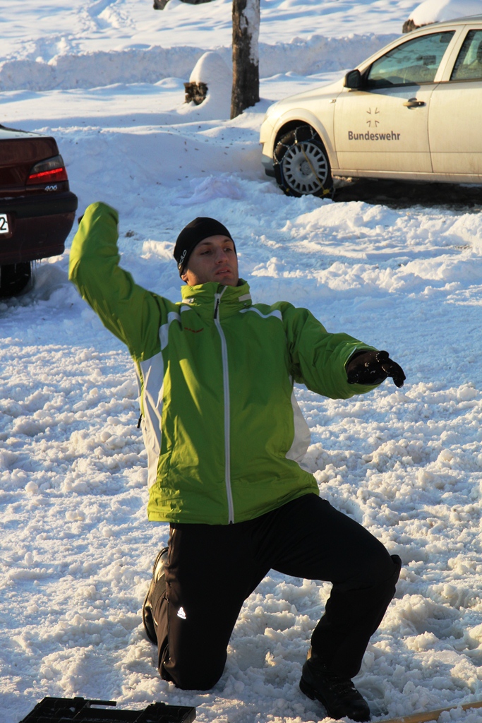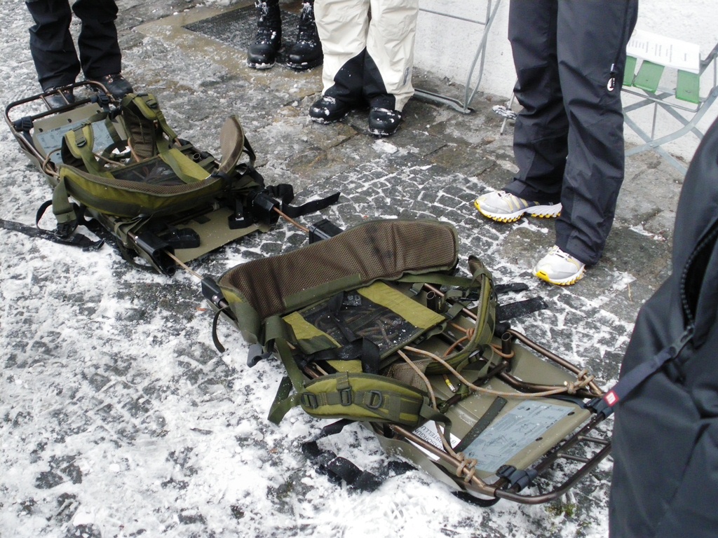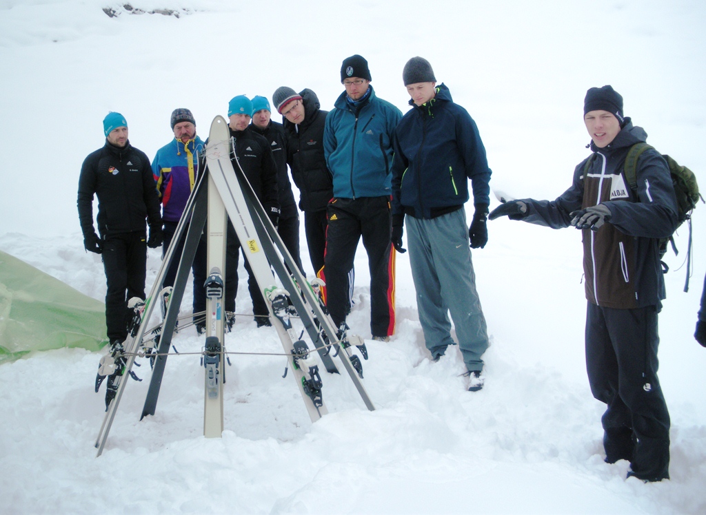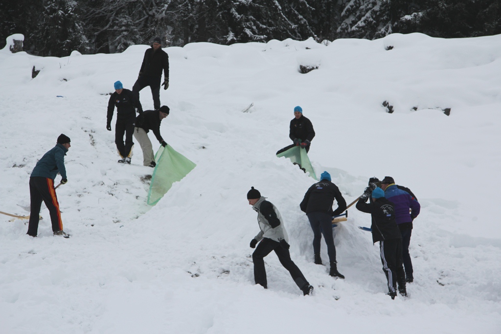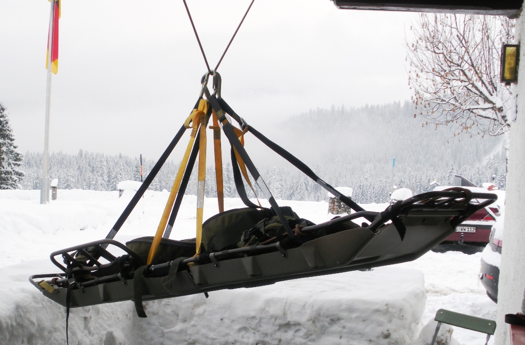 Als weitere Ausbildung war auch mit dabei der Umgang mit der Universaltrage UT 2000. Aus dem UT 2000 kann ein Verletztenschlitten - so wie bei der Skimeisterschaft benötigt - oder auch ein Tragekorb für den Hubschraubertransport gebaut werden. Bis alle Leinen richtigen sitzen, bedarf es schon etwas Übung. Auch der Umgang mit dem Lawinenverschüttetensuchgerät wurde geübt. Bei sicherer Handhabung kann ein Kamerad bis auf wenige Zentimeter genau geortet und dann schnell ausgegraben werden.