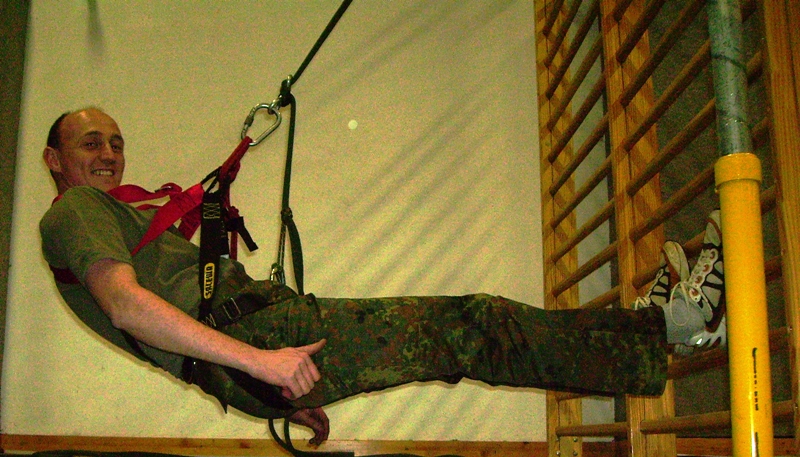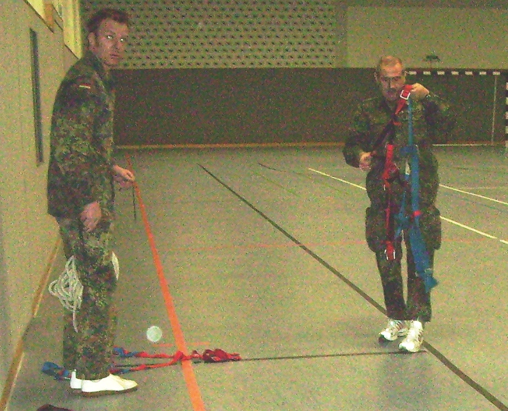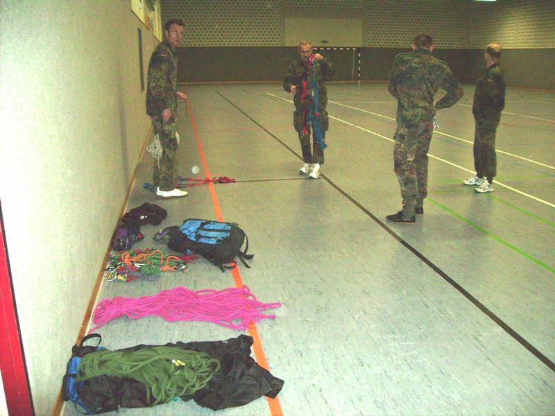 Nachdem immer wieder das Begehen von Seilstegen, Seilgeländern oder auch gesicherten Wegen bei Wettkämpfen auf dem Programm steht, widmete sich der Ausbildungsabend des Wettkampfkaders den Knoten, dem Anseilen und der richtigen Sicherung beim Begehen. Wegen des Wetters und der Uhrzeit wurde die Ausbildung kurzerhand in die Turnhalle verlegt.