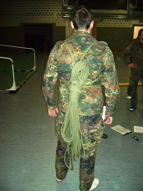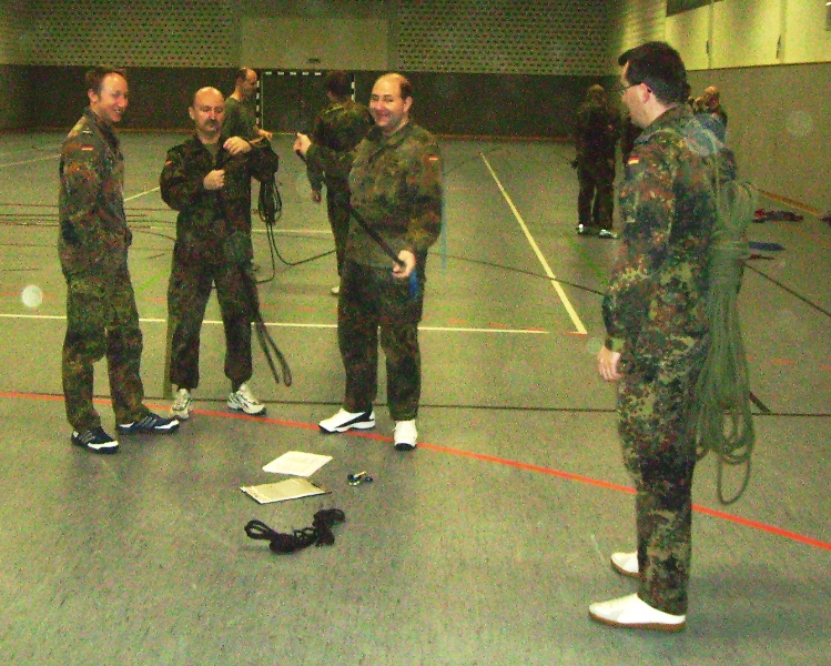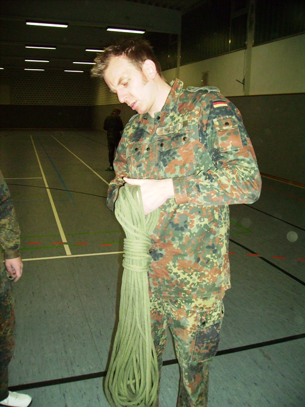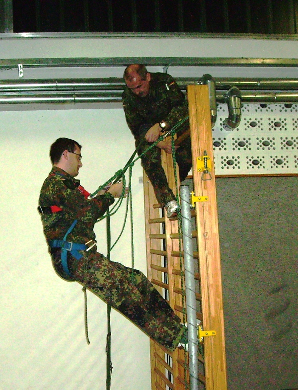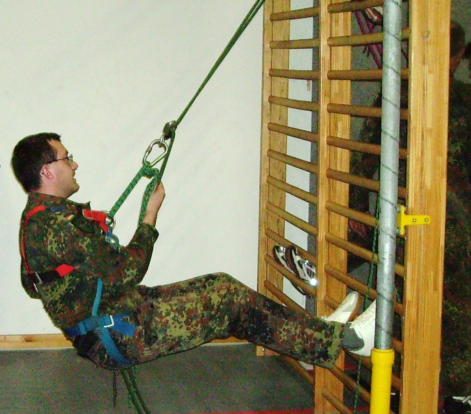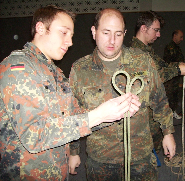 Mastwurf gesteckt und gelegt, Halbmastwurf, Prusikknoten, Sackstich gesteckt und gelegt - so und ähnlich lauteten die Anweisungen, die die Reservisten unter Anleitung auszuführen hatten. Nach ein bisschen Training gelangen die Knoten und das Anseilen bei allen Teilnehmern.