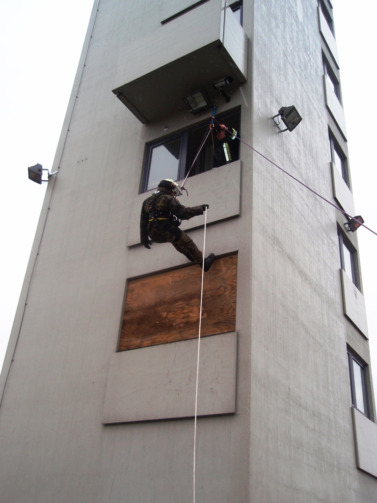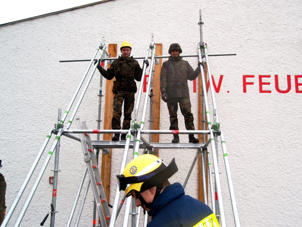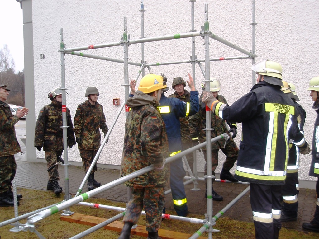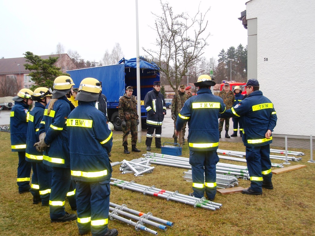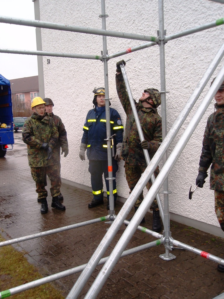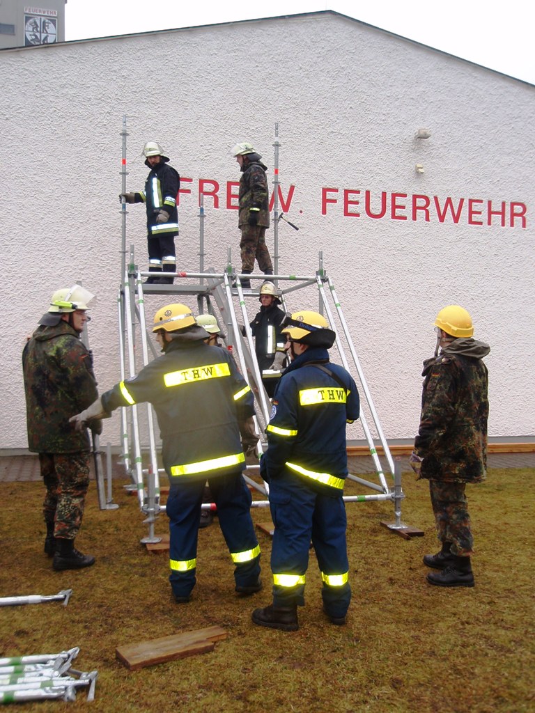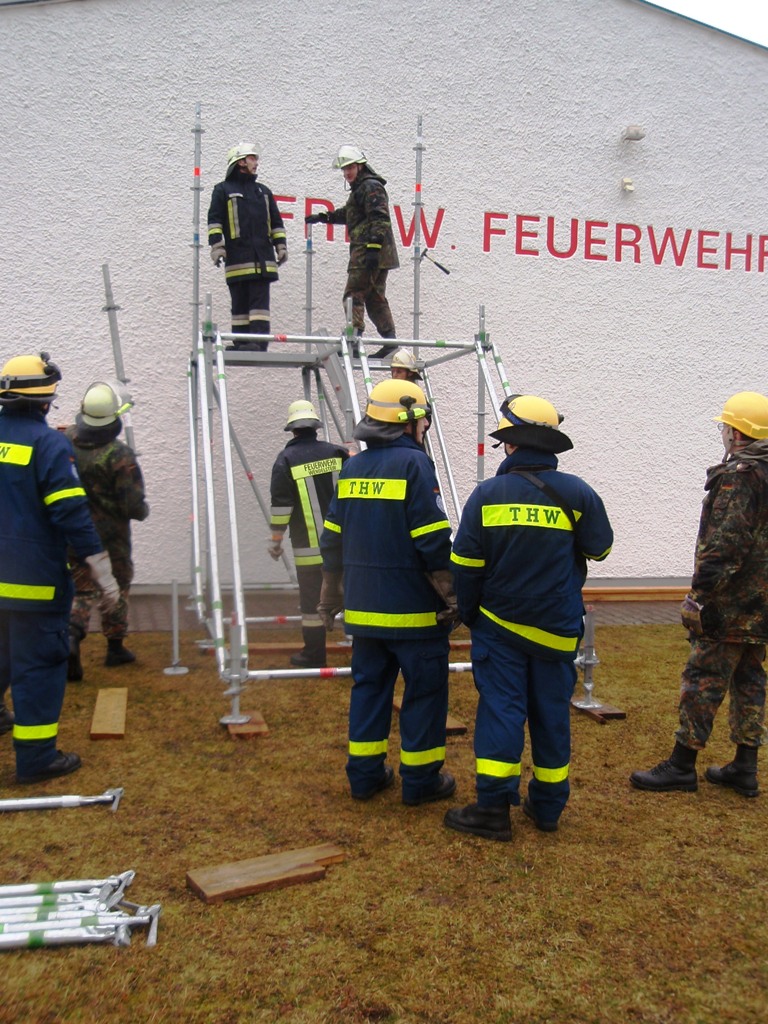 Um den Gerüstbau zur Absicherung Einsturz gefährdeter Mauern drehte sich alles bei der Station des THW aus Roth. Die Gruppe vom THW-Ortsverband Roth hatte ihren "großen" Gerüstbausatz mitgebracht, der verteilt auf ein Gerätefahrzeug mit zugehörigem Anhänger zur Grundausstattung des Bergungstrupps in allen Ortsverbänden gehört. Zusammen mit den Reservisten und Feuerwehrteilnehmern wurde in jeder der drei Teilnehmergruppen jeweils ein Hilfsgerüst mit zwei Arbeitsebenen errichtet, von dessen oberer Arbeitsebene aus auch die Rettung von Personen möglich ist und gleichzeitig die Einsturz gefährdete Mauer abgesichert wird.