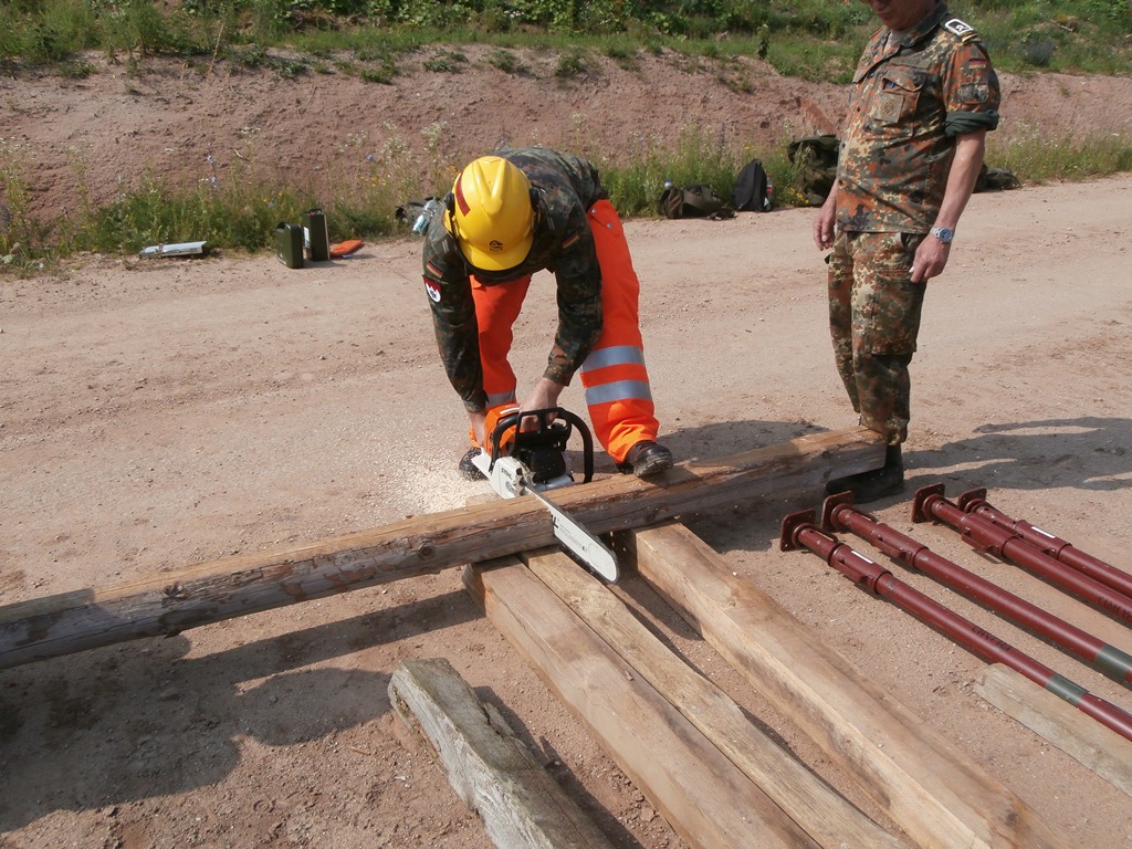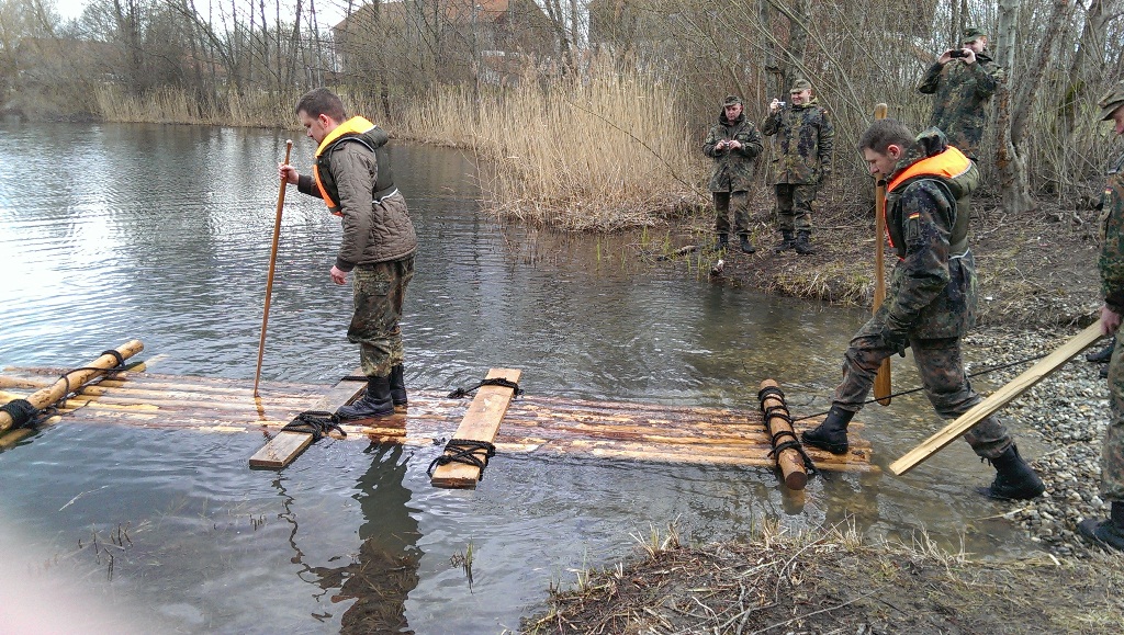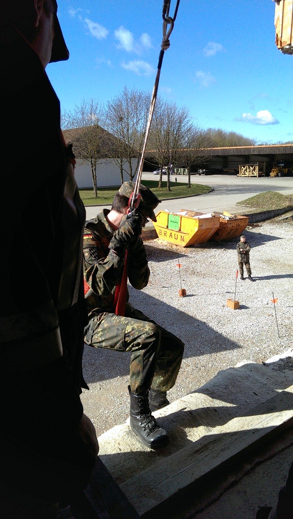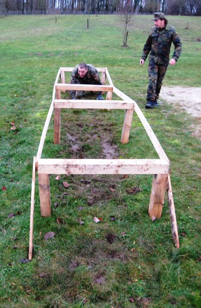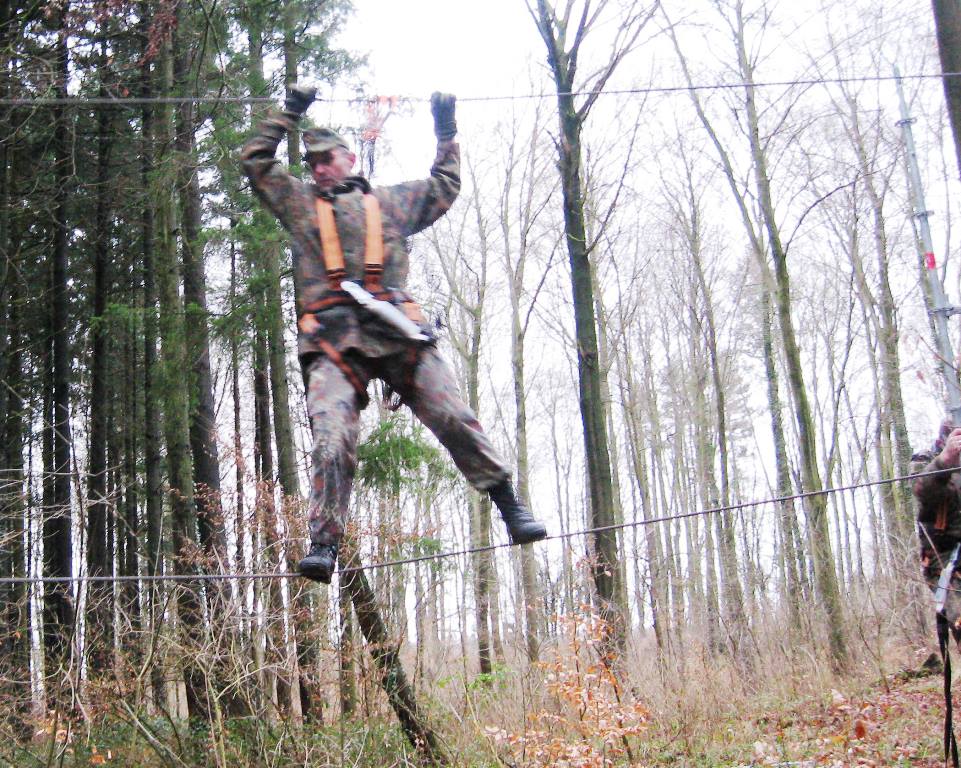 Der Wettkampf startete mit einer Tagphase, in welcher die Soldaten auf die Lage für die bevorstehende Nachtübung vorbereitet werden sollten. 20 Stationen waren im 15-minütigen Takt zu durchlaufen, oftmals viel zu wenig Zeit um alle Aufgabenstellungen an einer Station zu bewältigen. Für uns ging es los mit "Beobachten aus einer Scharfschützenstellung heraus sowie Geländespinne erstellen". Dann folgten verschiedene Schießaufgaben und der doppelte Seilsteg. Am einfachen Seilsteg musste das Wiederaufsteigen nach einem simulierten Absturz gezeigt werden, gar nicht so leicht, aber immerhin zwei aus der Mannschaft haben das geschafft. Bei der improvisierten Hindernisbahn folgte dann der Handgranatenzielwurf. Weiter ging's mit Erkennen von Uniformen und Flaggen, Checkpoints, AGSHP und Feuerlöschen. Letzte Aufgabe war dann die Inbetriebnahme eines Funkgeräts und Absetzen eines verschleierten Funkspruchs.