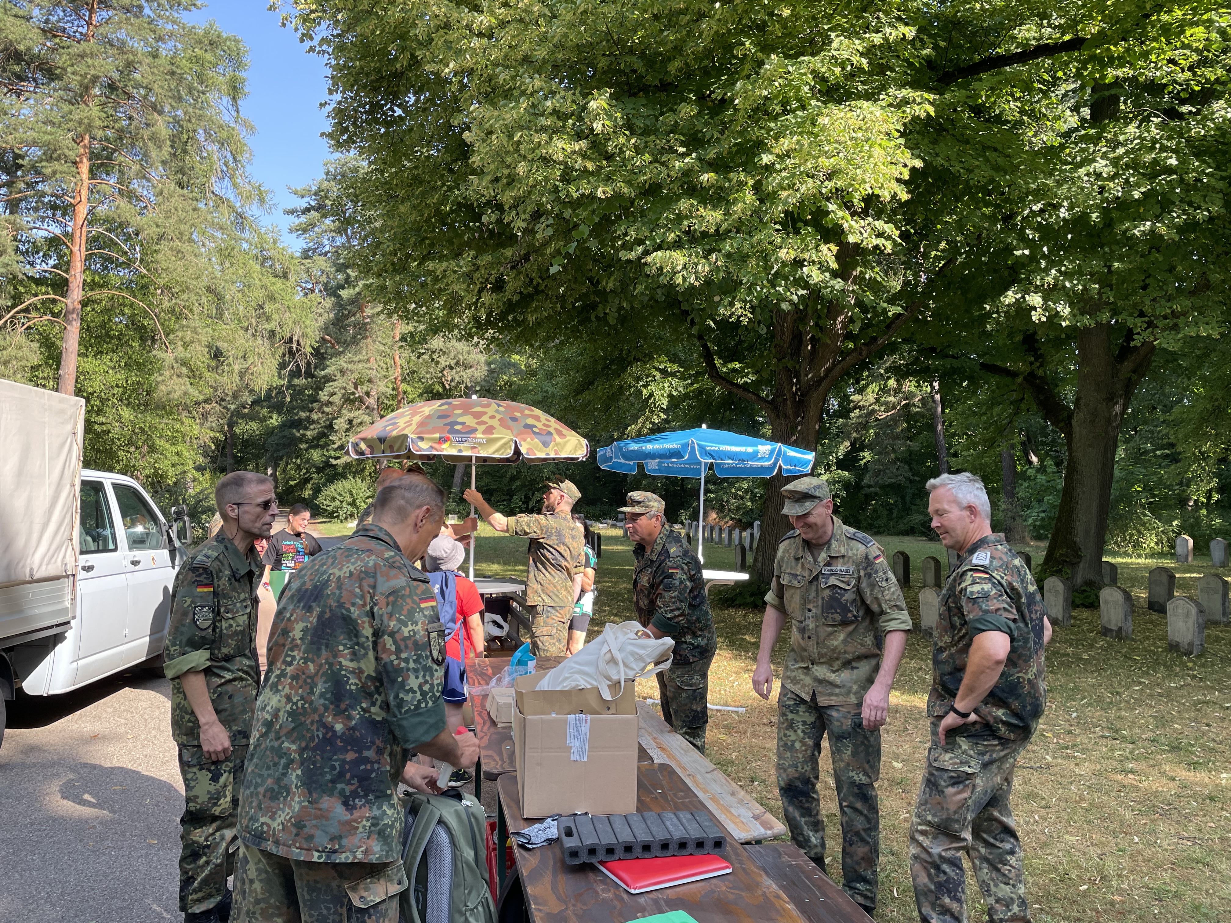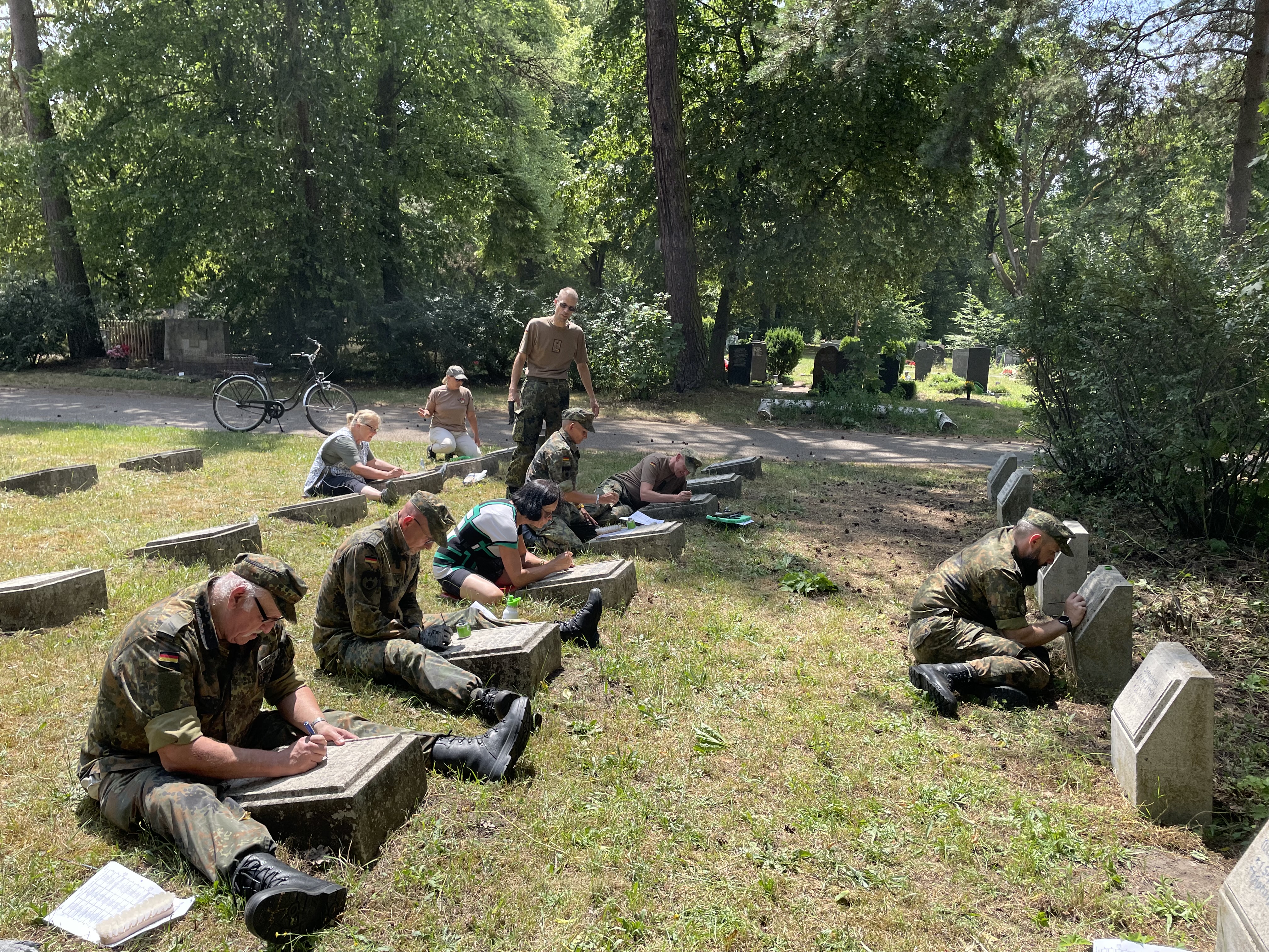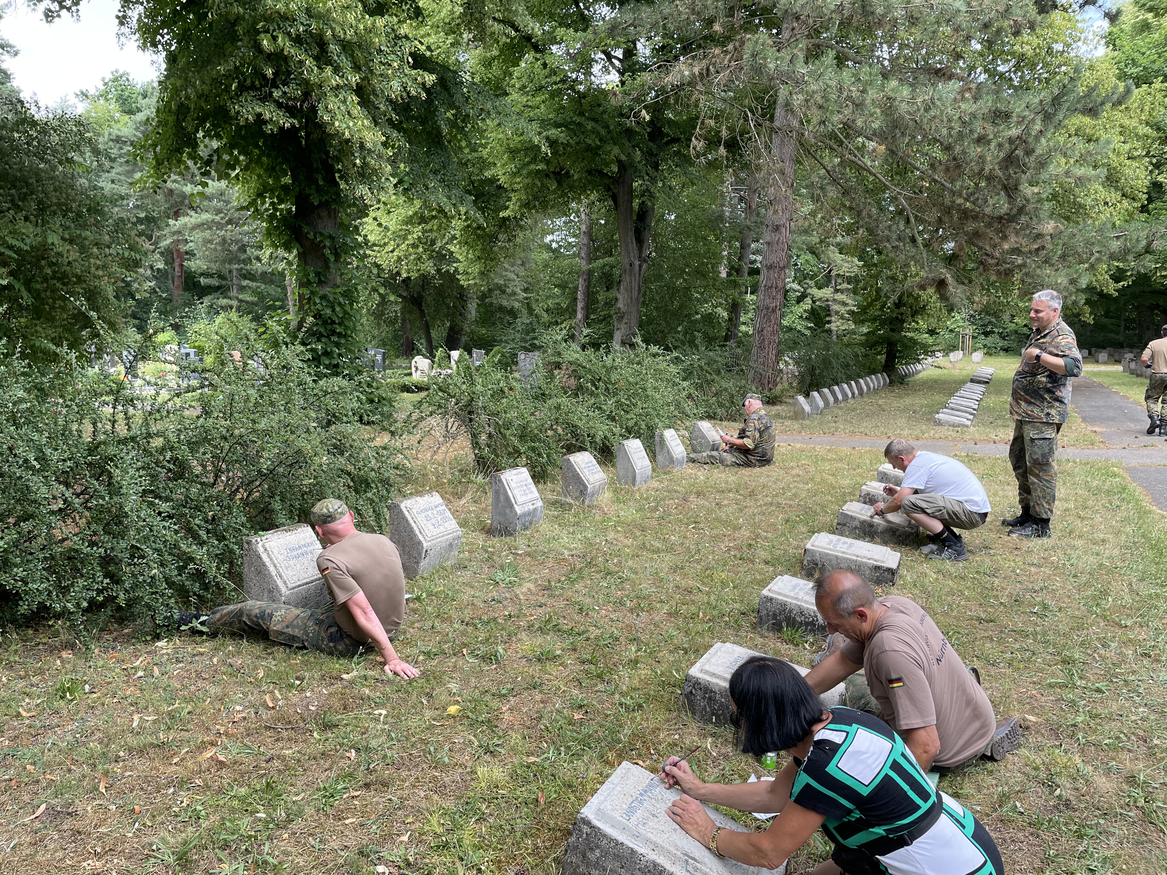 15 Kameraden aus verschiedenen Kreisgruppen und 5 zivile Helfer reinigten die Grabplatten um danach die Namen und Einheiten der hier beerdigten Soldaten wieder herzustellen.